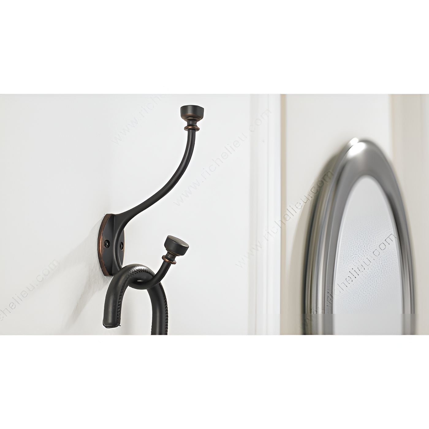 Richelieu BP71146ORB Classic Metal Hook - 71 offers an elegant solution for your storage needs while enhancing your interior décor. This dual arm design not only provides additional hanging capacity but also showcases a refined, timeless aesthetic ideal for various spaces, including bedrooms, bathrooms, entryways, mudrooms, and closets. Crafted from durable metal, this classic coat hook features an oil-rubbed bronze finish that adds a touch of sophistication to any room. With an overall height of 7 inches, a projection of 4 1/8 inches, and a width of 1 17/32 inches, it is designed to fit seamlessly into tight spaces while ensuring easy access to your belongings. The robust construction supports a load capacity of up to 22 pounds, making it suitable for heavy coats and bags. Installation is straightforward, as screws are included for mounting on walls or doors. The graceful geometry and fluid lines of this Roman style hook provide a classical touch that elevates the charm of your home. Choose the Richelieu BP71146ORB Classic Metal Hook to combine functionality with timeless design, ensuring your space remains organized and stylish.