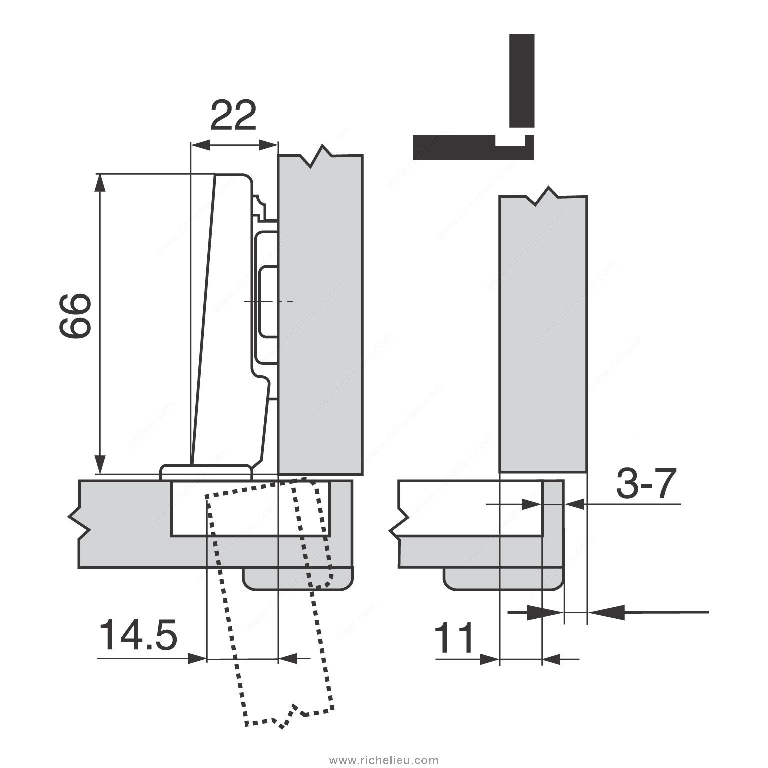 Richelieu BP71T55523180 CLIP top Hinge - 120 offers an ideal solution for frameless cabinetry with its exceptional design and functional performance. This hinge is engineered for full overlay doors, ensuring a seamless appearance while maximizing accessibility. With a minimum cabinet thickness of 5/8 inch, it provides robust support for standard doors, making it a versatile choice for various applications. Featuring a generous hinge opening angle of +120°, the BP71T55523180 allows for smooth and easy door operation, enhancing user convenience. Its spring-closing mechanism ensures that doors securely shut, adding an extra layer of functionality. The screw-on fixing type simplifies installation, allowing for quick setup without compromising stability. For milling requirements, this hinge has a milling diameter of 1 3/8 inches and a milling depth of 1/2 inch, making it compatible with standard cabinetry practices. Packaged in a convenient bag of two units, it is perfect for larger projects or replacements. Whether you are a building professional or a knowledgeable homeowner, the Richelieu BP71T55523180 CLIP top Hinge - 120 is a reliable choice for enhancing your cabinetry with stylish and effective hardware.