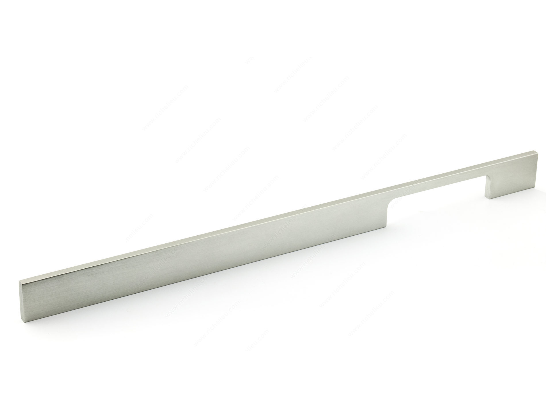 Richelieu BP720320195 Modern Aluminum Pull - 720 is a striking addition to any contemporary space, designed specifically for vertical applications. With its clean lines and asymmetrical shape, this pull enhances the modern aesthetic while offering practical functionality. Constructed from durable aluminum, the pull boasts a brushed nickel finish that radiates sophistication, complemented by a stylish gray and chrome color scheme. Its overall dimensions measure 15 1/8 inches in length, with a width of 1/4 inch and a projection of 1 1/16 inches, making it an ideal choice for various cabinetry and furniture applications. The pull features a center-to-center measurement of 12 5/8 inches, ensuring a comfortable grip with its off-center design, which adds a unique character to your installations. Each pull comes with 8/32 inch screws included for easy installation, allowing for quick updates to your space. Richelieu's commitment to quality is evident in this modern pull, making it a perfect choice for architects, builders, and homeowners looking to elevate their interior design. With the convenience of shipping via UPS, upgrading your cabinetry has never been easier. Transform your environment with this elegant and functional hardware solution.