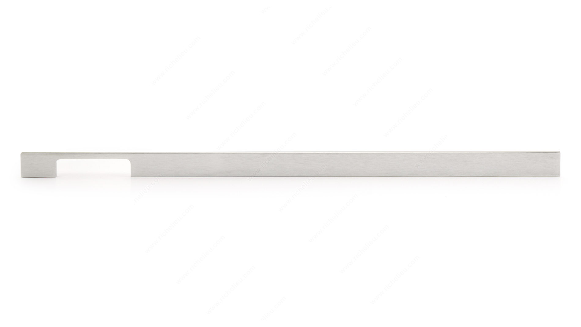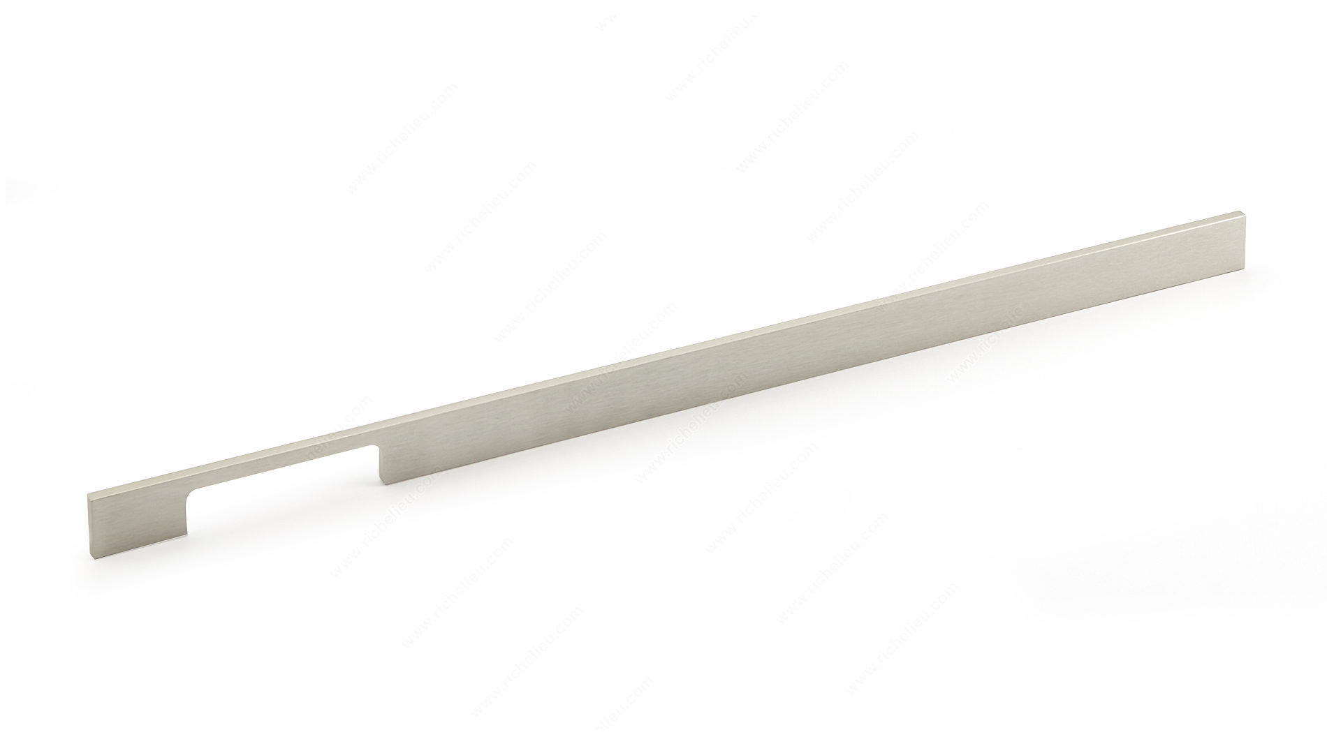 Richelieu BP720480195 Modern Aluminum Pull - 720 offers a stylish and functional solution for vertical applications, making it an ideal addition to contemporary spaces. Designed with clean lines and an off-center grip, this pull enhances a modern aesthetic while providing a comfortable, ergonomic handle. Measuring 21 3/8 inches in overall length and featuring an asymmetrical shape, it adds a unique touch to cabinets and drawers. The pull boasts a center-to-center measurement of 18 7/8 inches, ensuring compatibility with a variety of installations. Crafted from durable aluminum, it combines strength with a sophisticated brushed nickel finish, which is complemented by a sleek gray and chrome color palette. With a projection of 1 1/16 inches and a width of 1/4 inch, this pull is designed for ease of use while maintaining a low profile. It also comes with 8/32 inch screws included for a straightforward installation process. Whether you're updating your kitchen, bathroom, or office, the Richelieu BP720480195 pull is the perfect choice for those seeking both style and functionality in their hardware selections.