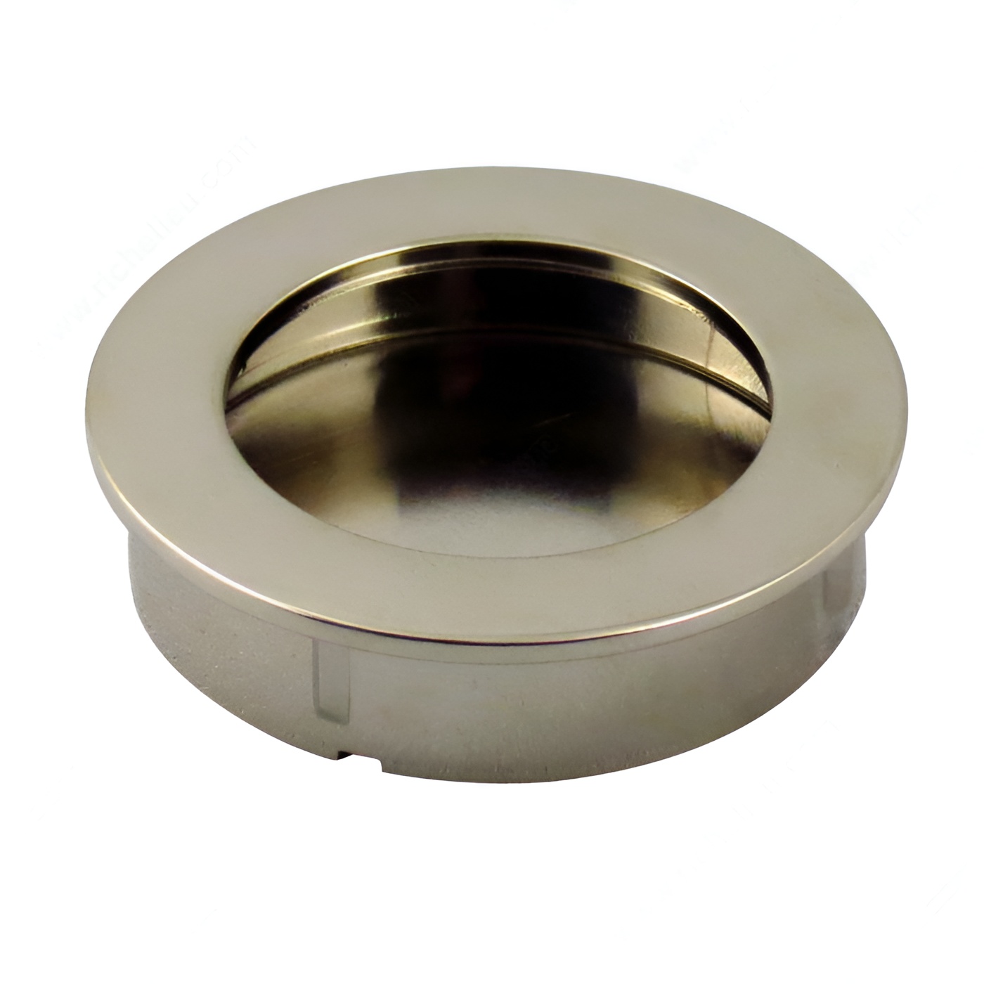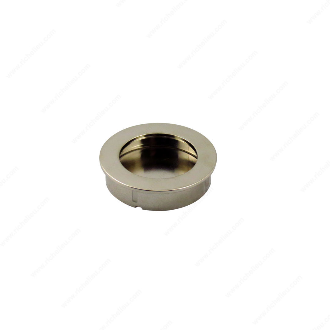 Richelieu BP72260180 Modern Recessed Metal Pull - 7226 enhances the aesthetic of your cabinetry with its sleek and contemporary design. This round recessed handle is specifically engineered to fit seamlessly into sliding cabinet doors, offering both style and functionality. Crafted from durable zamak, the handle boasts a polished nickel finish that adds a touch of elegance to any space. With an overall diameter of 2 3/8 inches and a height of 19/32 inches, this pull offers a comfortable grip while maintaining a low-profile appearance. The milling depth of 1/2 inch and diameter of 2 1/8 inches ensure an easy installation process, making it suitable for various cabinet types. Its projection of just 3/32 inches allows for a clean finish, avoiding any protrusion that could disrupt the sleek lines of your cabinetry. Available in a modern gray and chrome color palette, the Richelieu BP72260180 is designed to complement a range of interior styles. As a no-screw design, it simplifies installation and upkeep. Elevate your cabinetry with this stylish recessed pull, ideal for professionals and discerning homeowners looking to upgrade their kitchen or storage spaces. Ships conveniently via UPS for added convenience.