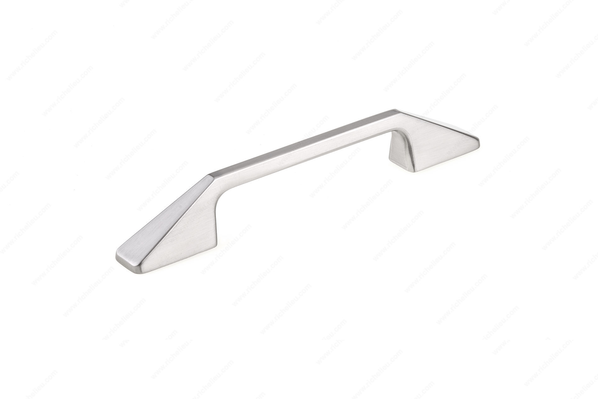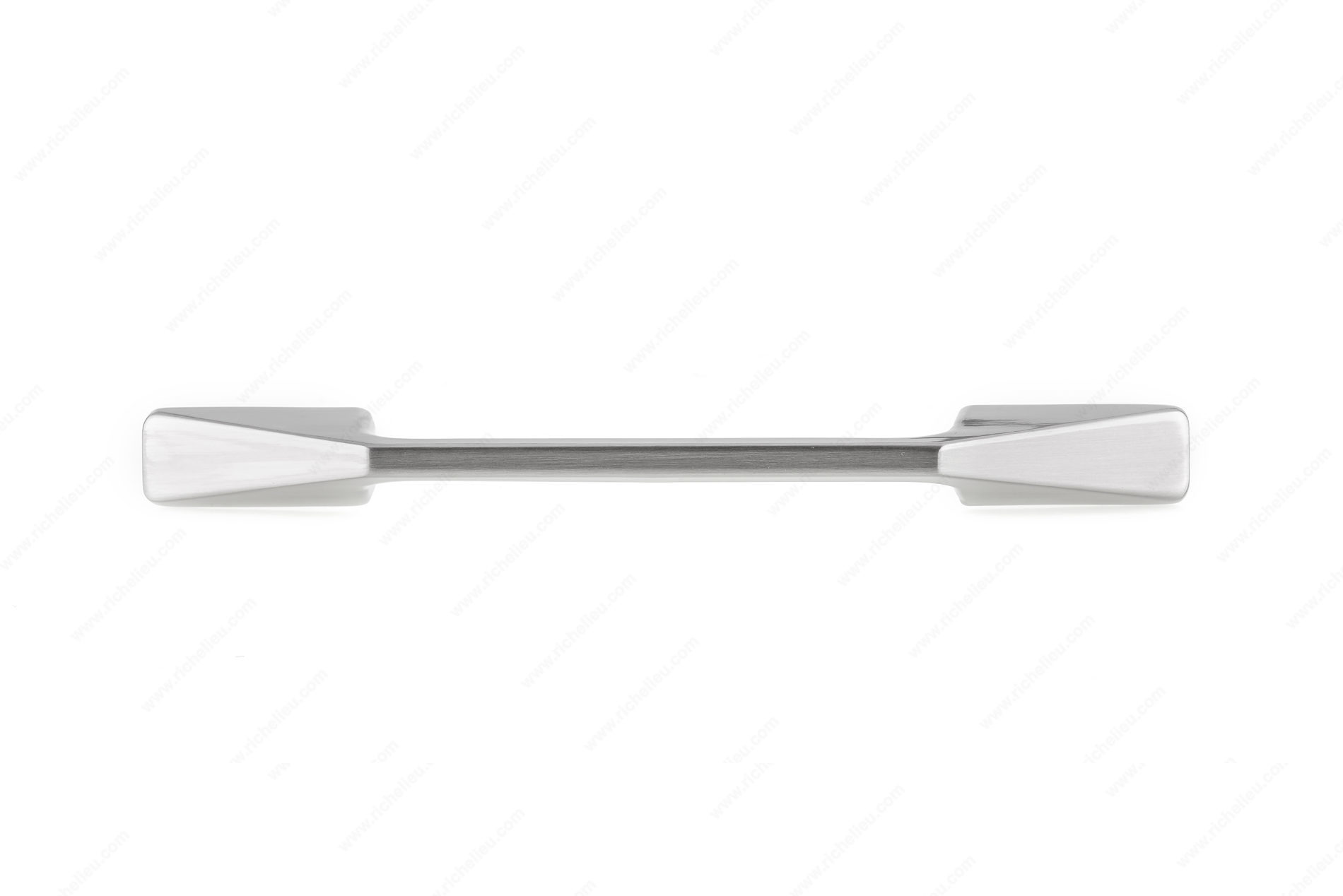 Richelieu BP7238128195 Modern Metal Pull - 7238 features an elegantly designed thin handle that flares out at both ends, supported by unique geometric posts. This modern pull is an innovative upgrade for contemporary furniture and cabinetry, making it a perfect choice for those looking to enhance their interior spaces. Crafted from durable zamak, this pull combines strength and style, adding a sophisticated touch to any piece. The brushed nickel finish in a striking gray and chrome color not only enhances its visual appeal but also ensures longevity. With an overall length of 6 27/32 inches and a center-to-center measurement of 5 1/32 inches, this pull fits seamlessly into modern design themes. Its compact projection of 1 1/32 inches and a width of 9/32 inches ensures it’s both practical and stylish. Each pull comes with an 8/32 inch screw included for easy installation, making it a hassle-free addition to your project. The BP7238128195 is part of the complete 7238 collection, allowing for coordinated design across multiple applications. Elevate your cabinetry and furniture with this striking modern pull from Richelieu, where functionality meets contemporary design.