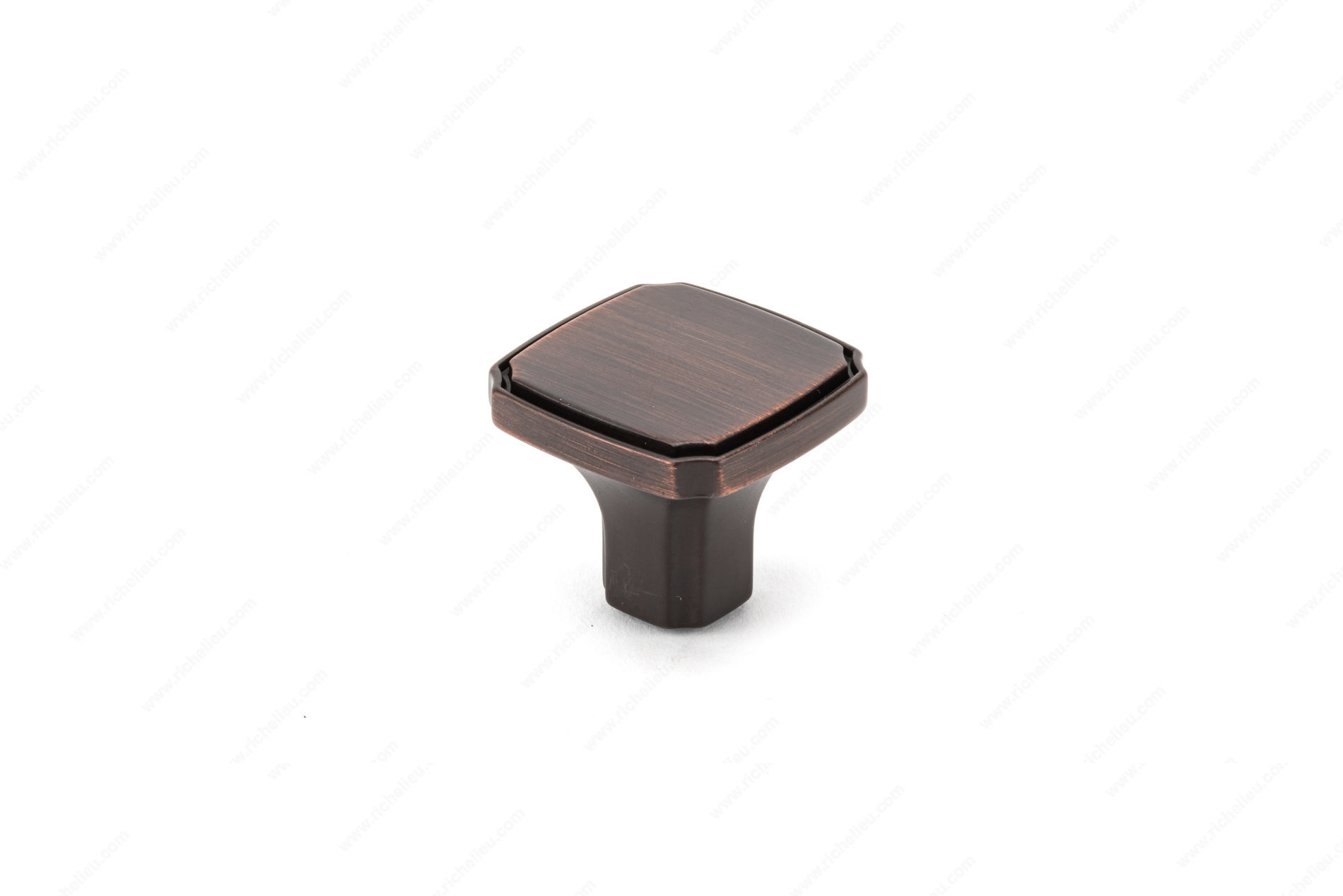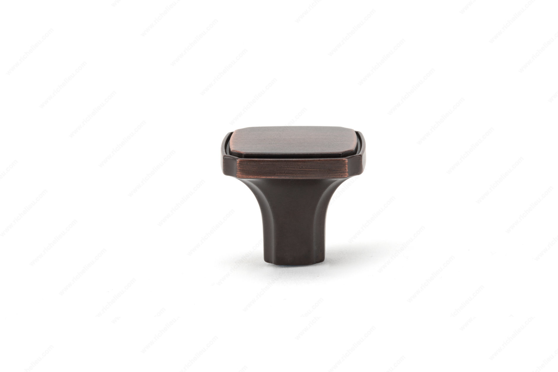 Richelieu BP77035BORB Transitional Metal Knob - 770 combines style and functionality to enhance your kitchen and bathroom furniture. This square knob features discreet edge and corner details, adding a touch of elegance to any cabinetry. Crafted from durable metal, it is finished in a luxurious brushed oil-rubbed bronze (BORB), providing a rich brown and bronze hue that complements a variety of design aesthetics. Measuring 1 3/8 inches in length and width, with a projection of 1 3/16 inches, this knob is perfectly sized for easy handling while maintaining a sleek profile. The transitional design makes it a versatile choice that fits seamlessly into both contemporary and traditional spaces. Each knob comes with an 8/32 inch screw included, ensuring a hassle-free installation process. Part of the complete 770 collection, the BP77035BORB is an excellent choice for those looking to upgrade their hardware with sophisticated accents. Whether you are renovating a kitchen or updating bathroom fixtures, this knob is sure to elevate the overall look of your cabinets. Choose Richelieu for high-quality hardware that combines timeless design with practicality, making it a preferred choice for building professionals and discerning homeowners alike.