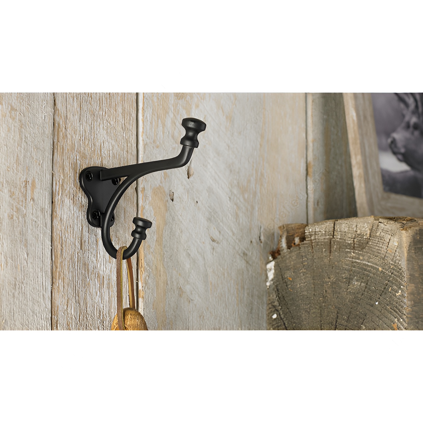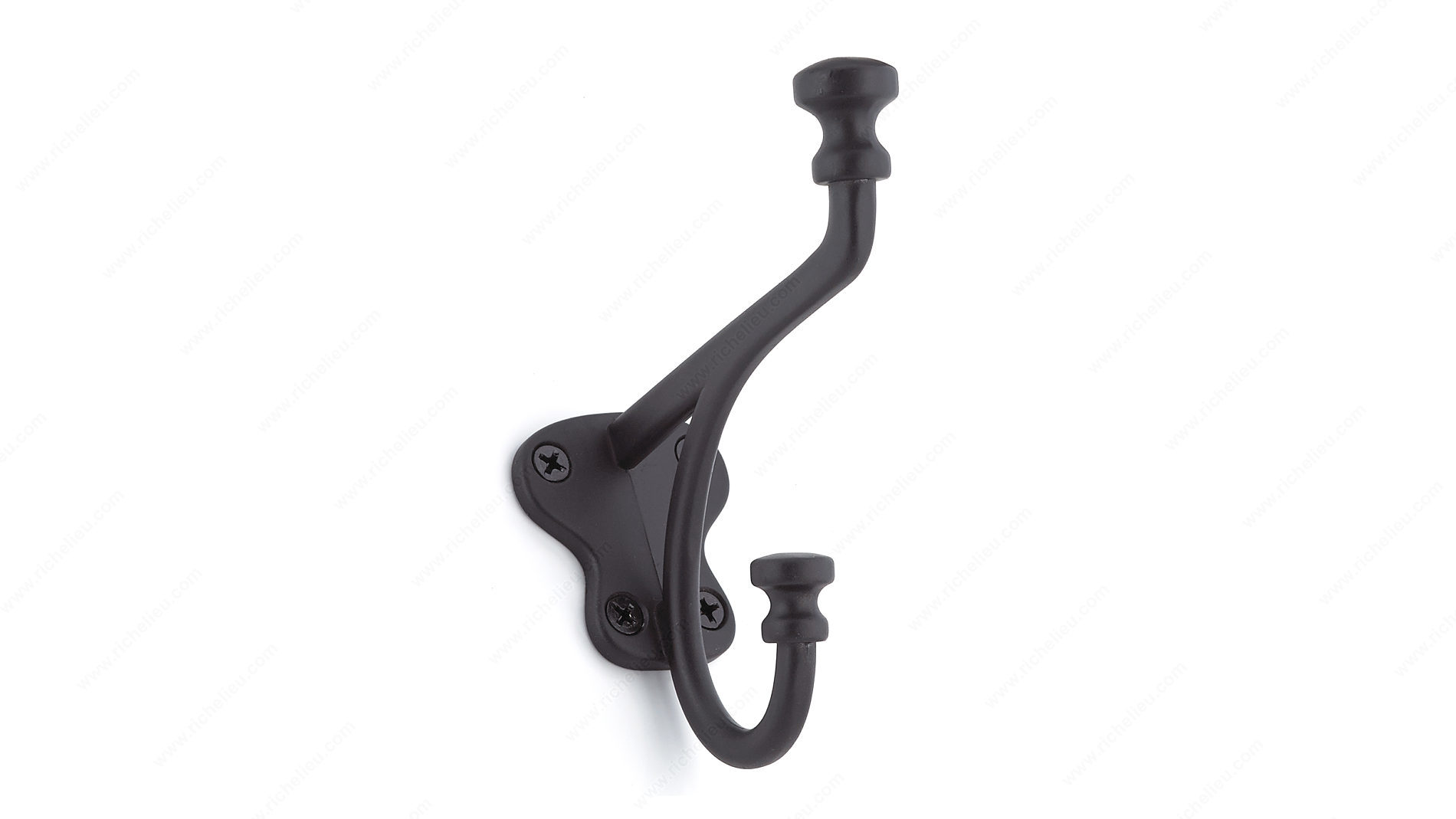 Richelieu BP77129900 Classic Metal Hook - 771 seamlessly blends functionality with elegance, making it a versatile addition to any space. This double hook design offers expanded storage potential, allowing you to efficiently organize your belongings while enhancing the aesthetic appeal of your room. With an overall height of 4 7/32 inches and a projection of 4 9/32 inches, this hook is well-suited for a variety of settings, including bedrooms, bathrooms, entryways, mudrooms, and closets. The hook features a sophisticated matte black finish, providing a timeless look that complements both modern and traditional decors. Crafted from durable metal, it boasts a robust load capacity of 22 pounds, ensuring it can handle your everyday needs with ease. Its compact dimensions, measuring 1 23/32 inches in width and a center-to-center distance of 1 5/32 inches, make it an ideal choice for tight spaces. Installation is straightforward, as screws are included, allowing you to mount this stylish accessory on walls or doors effortlessly. Available in both gray and chrome or black, the Richelieu Classic Metal Hook not only serves a practical purpose but also elevates the overall ambiance of any room.