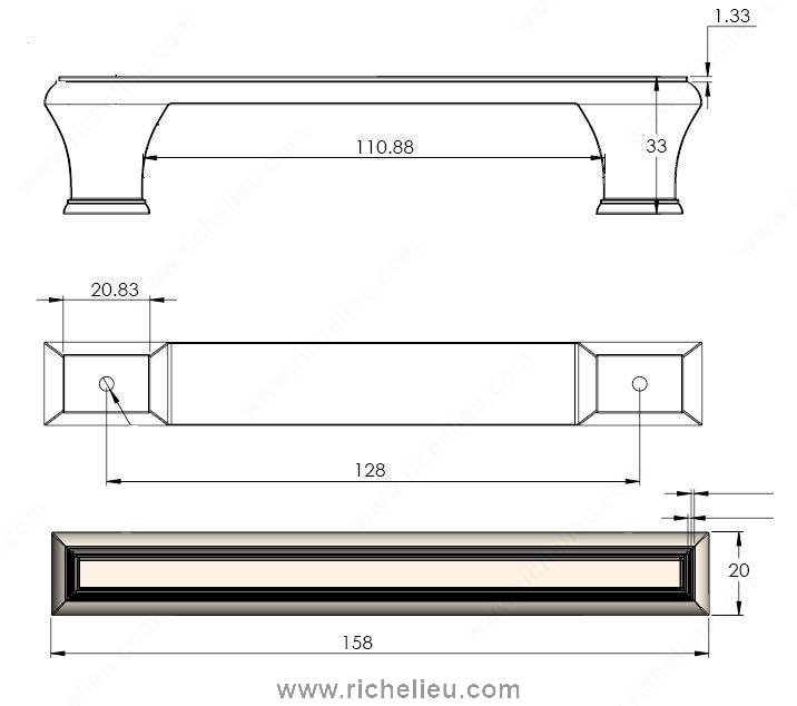 Richelieu BP775128BORB Traditional Metal Pull - 7759 is a stunning addition to any kitchen or bathroom cabinetry. This classic rectangular pull features a refined brushed oil-rubbed bronze finish, exuding elegance and sophistication that complements a variety of interior styles. The pull's beveled edge and tapered feet enhance its aesthetic appeal, making it a perfect choice for homeowners and professionals looking to elevate their space. With an overall length of 6 7/32 inches and a center-to-center measurement of 5 1/32 inches, this pull is thoughtfully designed for both functionality and style. The material is crafted from durable zamak, ensuring longevity and resilience even in high-traffic areas. The traditional design adds a touch of timeless charm, making it suitable for various collections, including models 7753 and 7759. Installation is made simple with included 8/32 inch screws, allowing for a hassle-free upgrade to your cabinetry. The overall projection of 1 5/16 inches provides a comfortable grip. Whether you are renovating a space or designing a new one, the Richelieu BP775128BORB Traditional Metal Pull is the perfect finishing touch that combines practicality with a classic look.