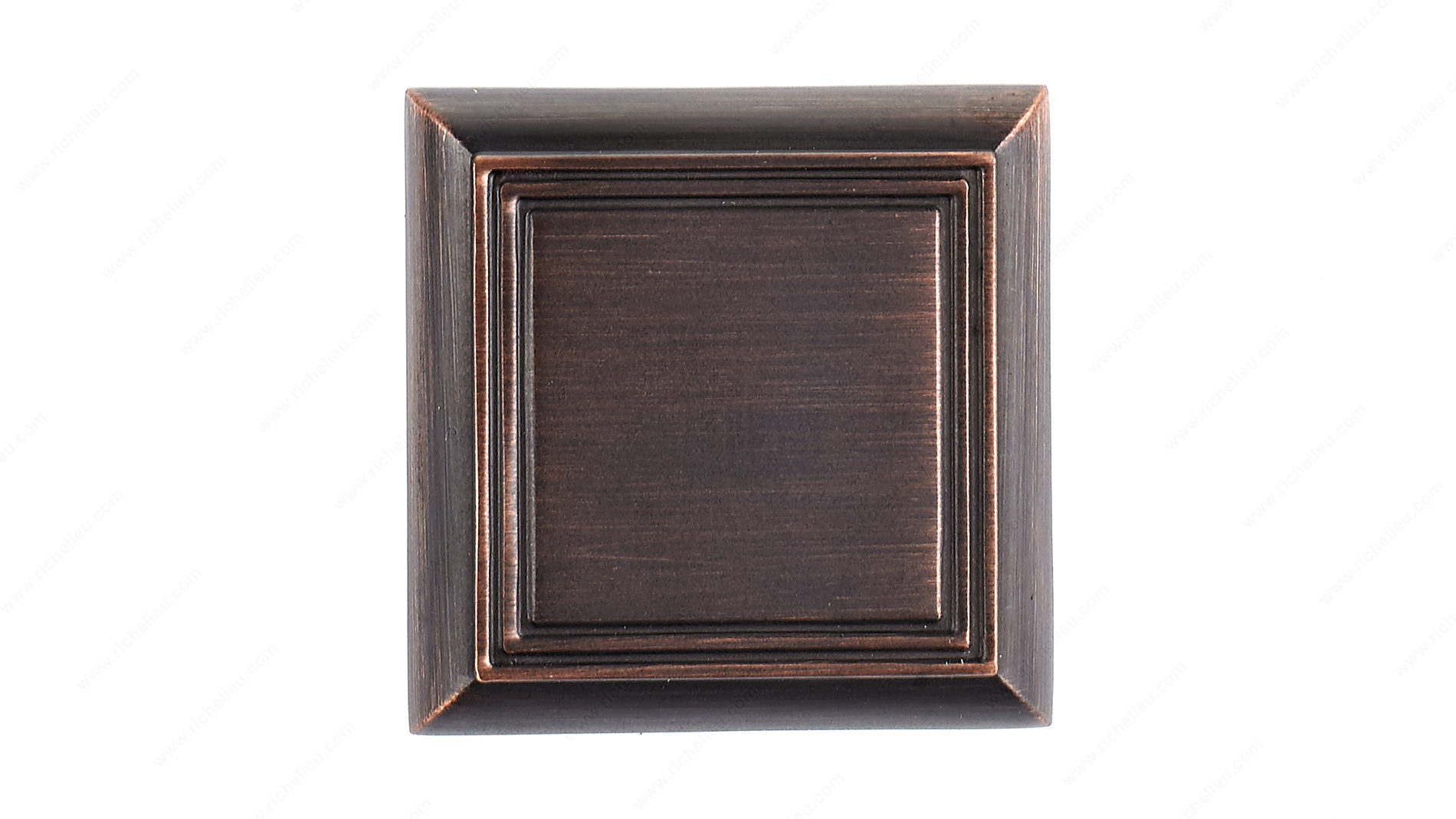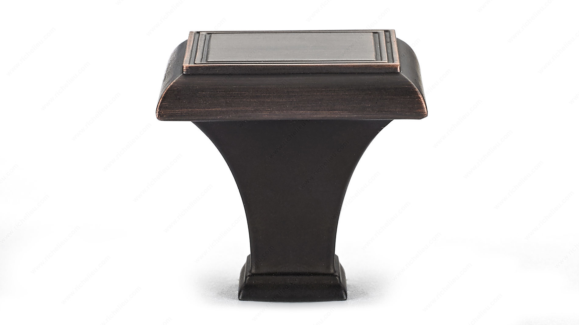 Richelieu BP77535BORB Traditional Metal Knob - 7753 features a classic rectangular design that seamlessly blends elegance with functionality, making it an exquisite choice for kitchen and bathroom cabinetry. Crafted from high-quality zamak, this knob boasts a brushed oil-rubbed bronze finish (BORB), offering a rich brown and bronze hue that enhances any decor style. The elegant frame is accentuated by beveled edges on a tapered base, providing a sophisticated touch that complements traditional and contemporary settings alike. With overall dimensions of 1 3/8 inches in length and width, and a projection of 1 5/16 inches, this knob is perfectly sized for easy grip and functionality. Included with the knob is an 8/32 inch screw, ensuring straightforward installation. As part of the complete collection, it coordinates beautifully with other models in the 7753/7759 series, allowing for a cohesive design throughout your space. Whether you’re renovating an entire kitchen or simply updating a single drawer, the Richelieu BP77535BORB Traditional Metal Knob is an ideal choice that combines style and durability, making it a valuable addition to your home.