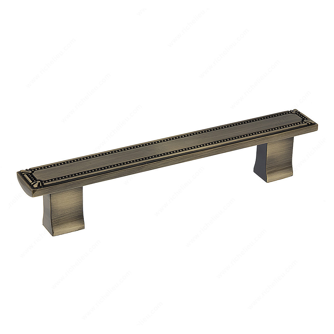 Richelieu BP780128AE Traditional Metal Pull - 7809 combines classic design with modern functionality. This exquisite pull features a squared-tube handle with rounded corners, providing both comfort and style. The square flange at each end enhances its traditional appearance, making it an ideal choice for a variety of cabinetry and furniture. Crafted from durable zamak material, this pull ensures long-lasting performance while adding a touch of elegance to your space. Its antique English finish in yellow and brass brings a warm, vintage charm that complements various decor styles. With an overall length of 6 21/32 inches and a width of 7/8 inch, it is perfectly sized for easy gripping. The center-to-center measurement of 5 1/32 inches allows for straightforward installation, making it an excellent choice for both new projects and renovations. This traditional pull is part of the complete Richelieu collection, compatible with models 7803 and 7809. Each pull comes with the necessary 8/32 inch screws for easy mounting. Its overall projection of 1 5/16 inches ensures a comfortable reach, making it not just a functional piece, but a decorative one as well. Elevate your cabinetry with the timeless appeal of the Richelieu Traditional Metal Pull.