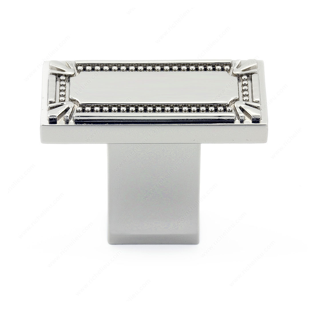 Richelieu BP78033180 Traditional Metal Knob - 7803 is a stunning example of classic craftsmanship that enhances the aesthetic of any kitchen or bathroom. This intricately detailed rectangular knob features a polished nickel finish, offering a sophisticated gray and chrome look that elevates its surroundings. Measuring 1 11/16 inches in length, 7/8 inches in width, and with a projection of 1 5/16 inches, this knob is perfectly sized for easy handling while maintaining a striking visual presence. Constructed from durable zamak, the BP78033180 knob is not only stylish but also built to last. It complements various cabinetry styles, especially those within the Classic collection, and is designed to seamlessly integrate with the 7803/7809 models. With an included 8/32 inch screw, installation is straightforward, making it an ideal choice for both professional builders and DIY enthusiasts. Whether you're renovating a space or simply looking to update your hardware, this traditional knob provides a functional yet elegant touch. Enhance your cabinetry with the timeless allure of the Richelieu BP78033180 Traditional Metal Knob and enjoy the perfect blend of form and function in your home.