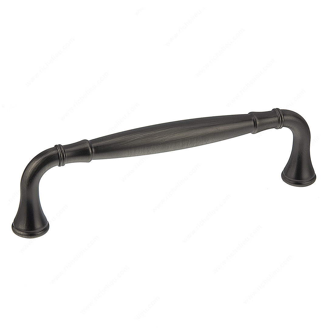 Richelieu BP790128143 Traditional Metal Pull - 790 showcases an elegant arched handle with flared ends, embodying a classic design that enhances the aesthetics of any kitchen or bathroom. Crafted from durable Zamak, this pull not only adds charm but also ensures longevity, making it a reliable choice for professional and residential use alike. With a center-to-center measurement of 5 1/32 inches, this pull fits seamlessly into various cabinetry styles. The antique nickel finish gives it a sophisticated touch, while the gray and chrome accents elevate its overall appeal. Measuring 5 21/32 inches in length and 5/8 inches in width, the pull is designed for both functionality and style, with a projection of 1 9/16 inches that provides a comfortable grip. Included with the pull is an 8/32 inch screw, ensuring easy installation. This piece is part of the complete 790 collection, allowing for cohesive design across various spaces. Whether you are remodeling or building from scratch, Richelieu’s Traditional Metal Pull will be an excellent addition, merging timeless style with modern durability, perfect for discerning homeowners and skilled builders alike.