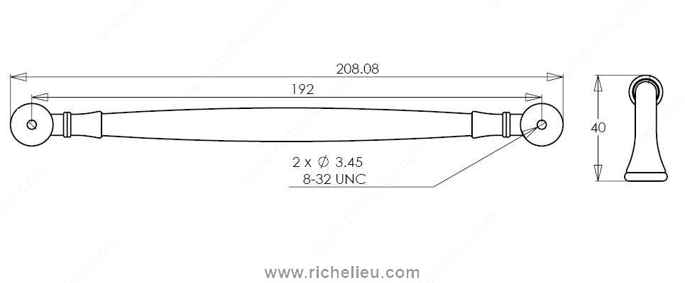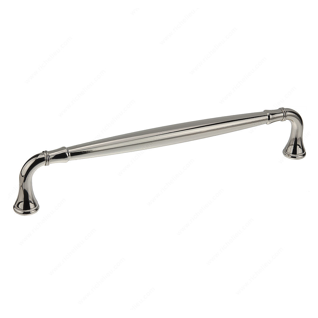 Richelieu BP790192180 Traditional Metal Pull - 790 is a sophisticated addition to any kitchen or bathroom, embodying timeless elegance. This pull features an elegantly arched handle with flared ends, making it a quintessential choice for enhancing your décor. Crafted from durable zamak, this pull is built to withstand daily use while maintaining its polished nickel finish, adding a touch of shine to your cabinetry. With a center-to-center measurement of 7 9/16 inches, it offers a comfortable grip while also fitting seamlessly into existing spaces. The overall dimensions of 8 3/16 inches in length, 5/8 inch in width, and a projection of 1 9/16 inches make it a versatile option for various applications. The traditional design is perfect for those seeking a classic aesthetic that complements a wide range of styles. Included with your purchase are 8/32 inch screws, ensuring straightforward installation. This pull is part of the complete 790 collection, allowing for cohesive design throughout your space. Whether you're renovating or simply updating your fixtures, the Richelieu BP790192180 Traditional Metal Pull brings both functionality and refined style to your home.