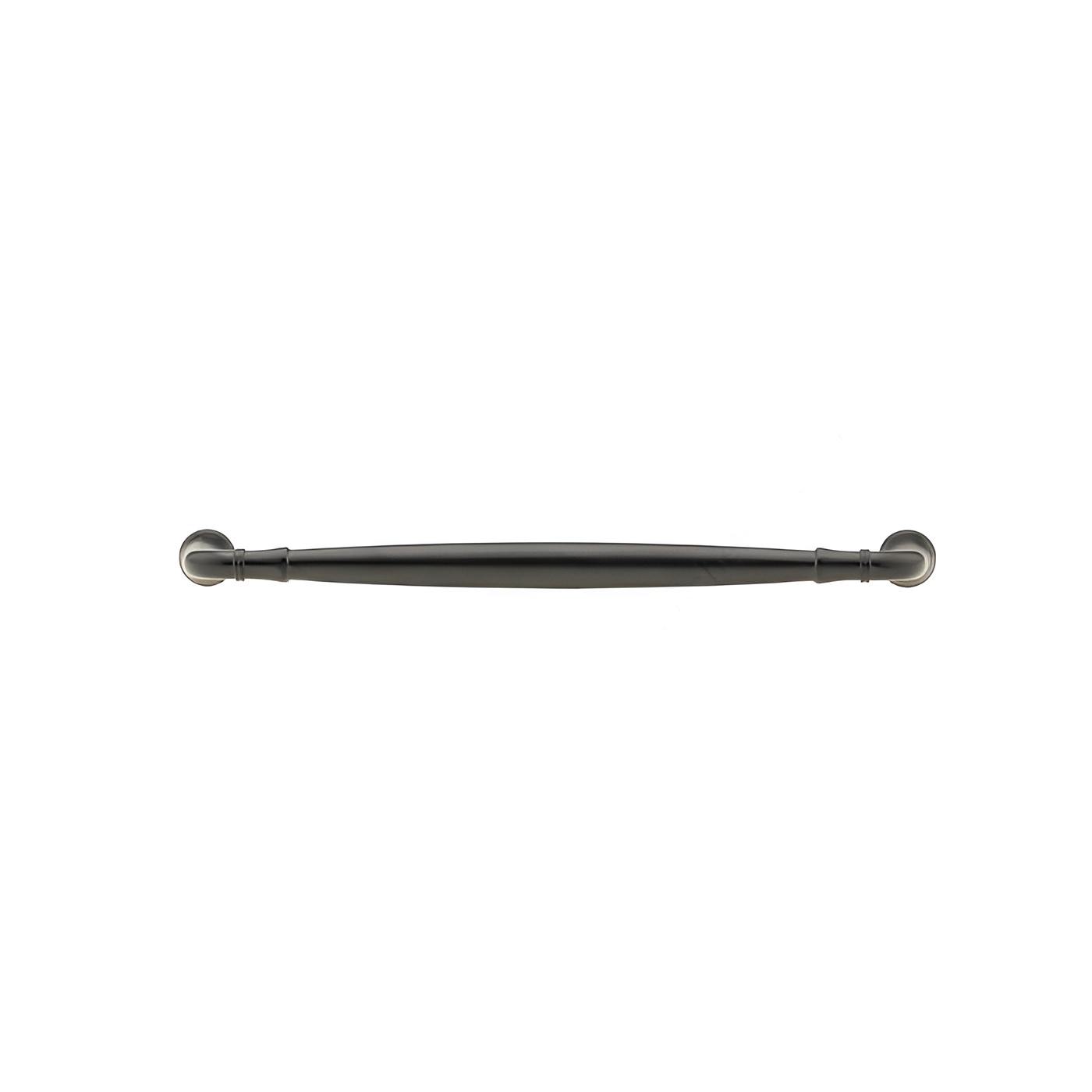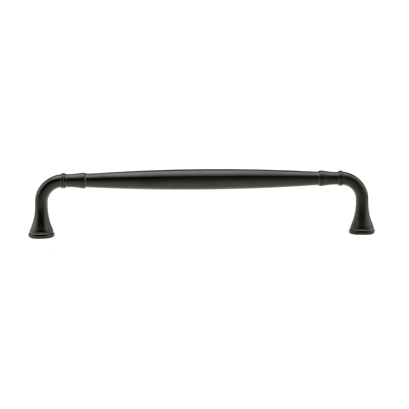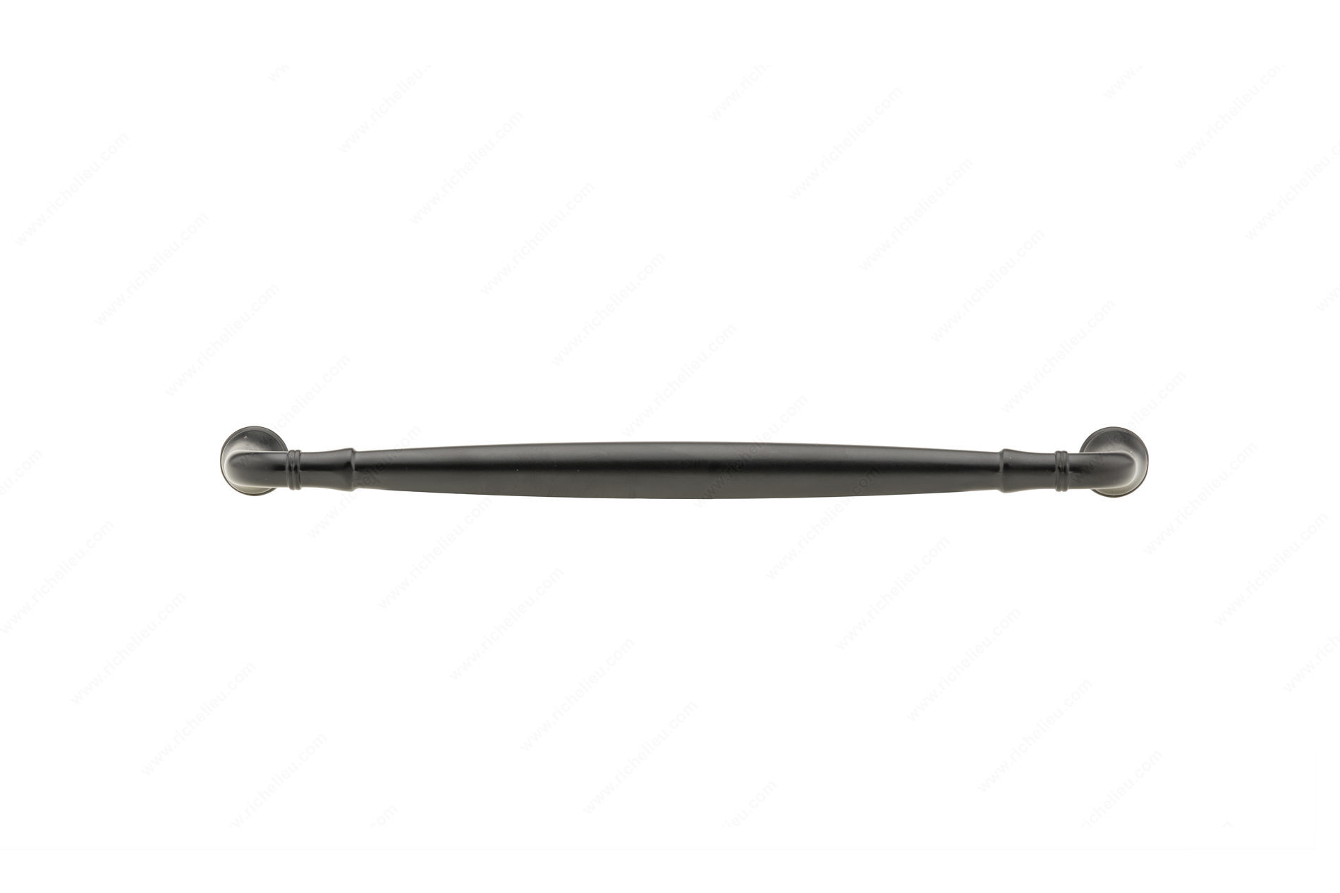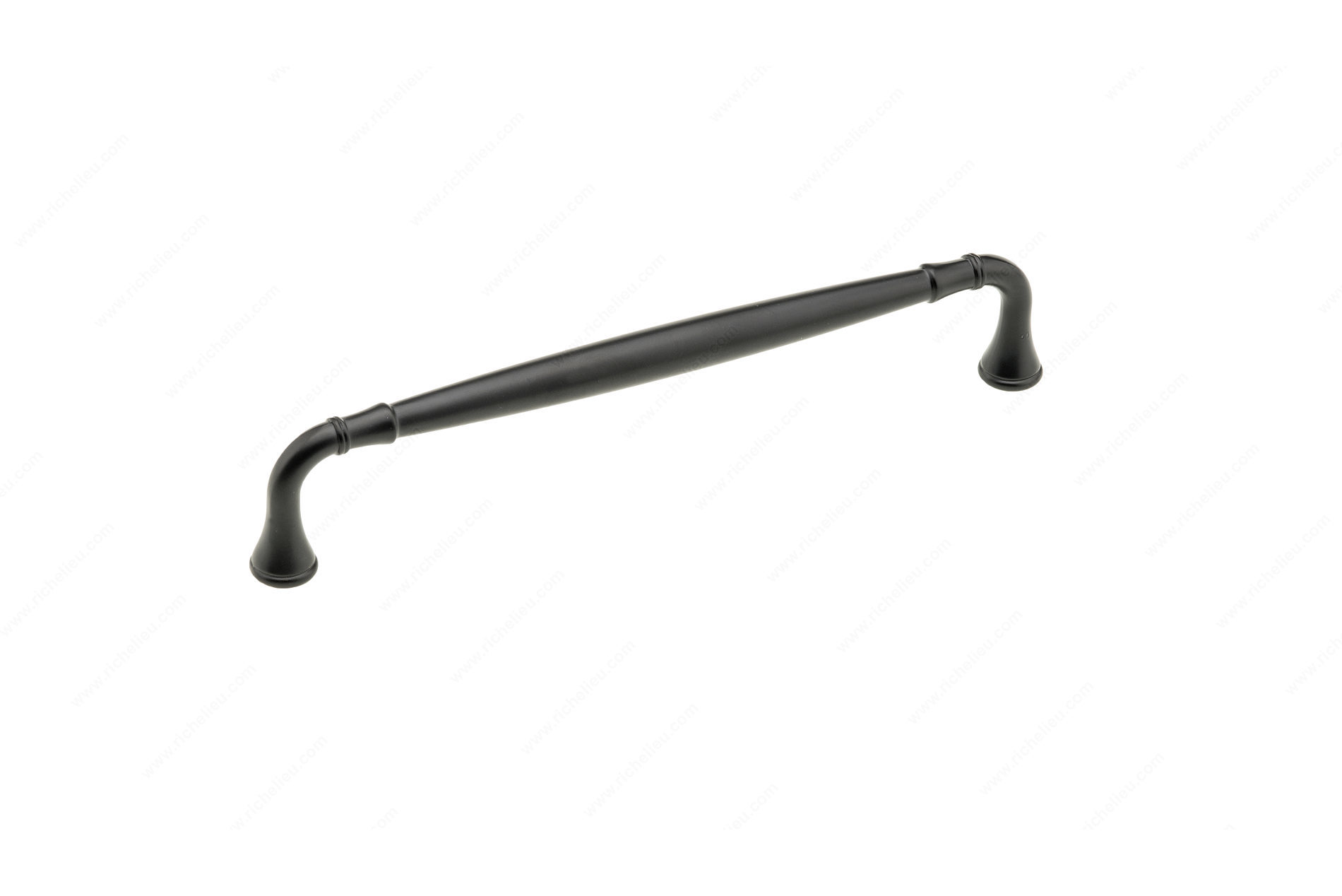 Richelieu BP790192900 Traditional Metal Pull - 790 effortlessly combines elegance and functionality, making it an ideal choice for enhancing the décor of both kitchens and bathrooms. Featuring a graceful arched handle with flared ends, this pull adds a classic touch to any cabinetry design. With an overall length of 8 3/16 inches and a center-to-center measurement of 7 9/16 inches, this pull is well-suited for a variety of applications. The matte black finish, complemented by gray and chrome tones, provides a contemporary appeal while ensuring durability. Made from high-quality zamak, it promises longevity and resilience in everyday use. The pull's traditional style is perfect for those looking to maintain a timeless aesthetic, while its dimensions-1 9/16 inches in projection and 5/8 inches in width-offer a comfortable grip. Each pull comes with the necessary 8/32 inch screws for easy installation, ensuring a hassle-free upgrade to your cabinetry. Part of the New Collection and compatible with all models in the 790 series, the Richelieu BP790192900 provides a seamless blend of style and practicality, making it a must-have accessory for any renovation or design project. Elevate your space with this exquisite traditional pull.