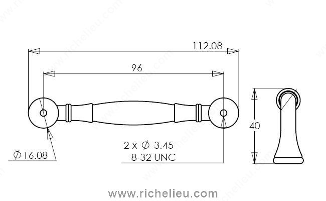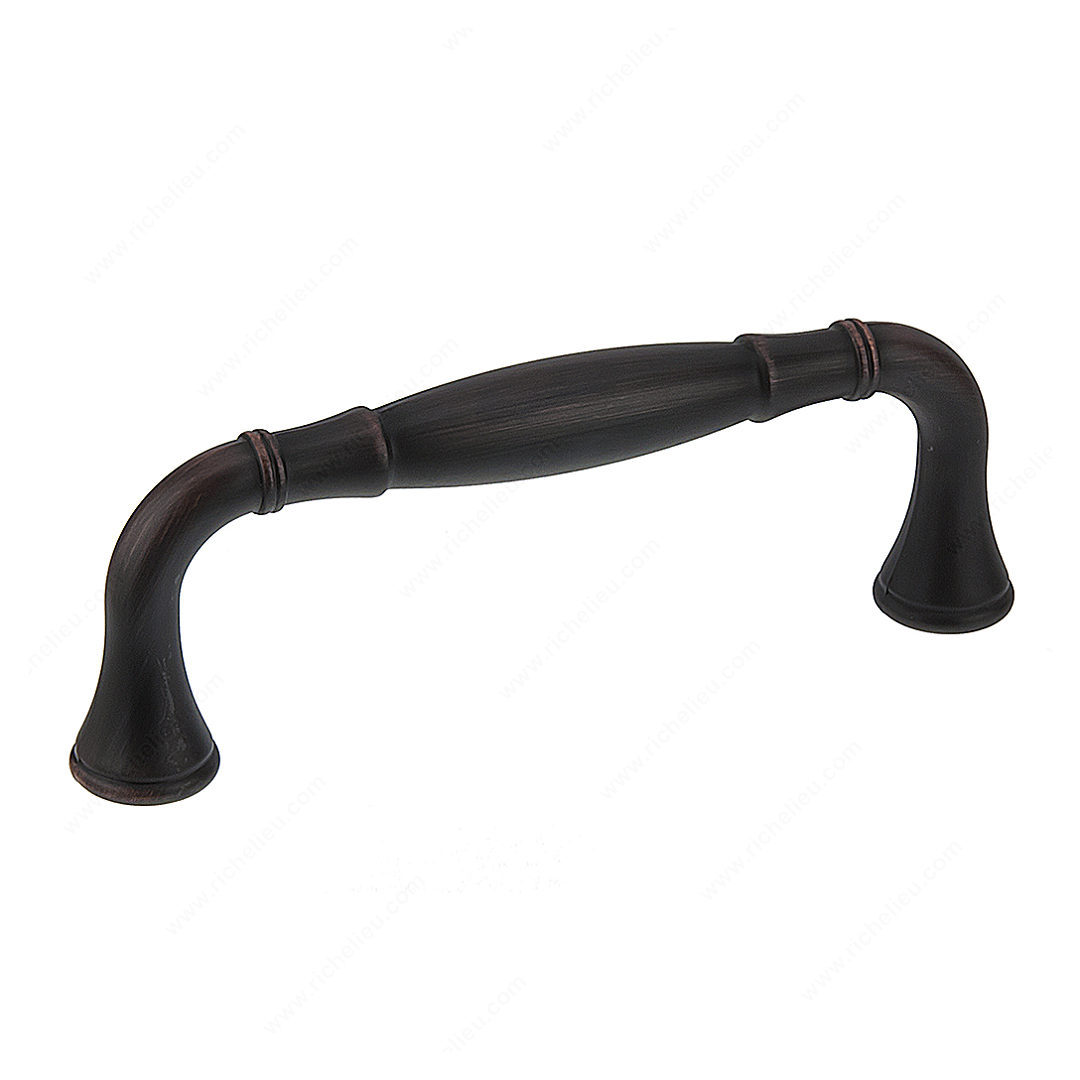 Richelieu BP79096BORB Traditional Metal Pull - 790 combines timeless design with modern functionality, making it an ideal choice for enhancing the décor of any kitchen or bathroom. This elegant pull features an arched handle with flared ends, embodying a classic aesthetic that complements both contemporary and traditional styles. The brushed oil-rubbed bronze finish adds a touch of sophistication, ensuring it stands out while seamlessly integrating into your existing décor. With an overall length of 4 13/32 inches and a center-to-center measurement of 3 25/32 inches, this pull is designed to fit a variety of cabinet applications. Its sturdy construction from zamak ensures durability, making it an excellent choice for high-use areas. The projection of 1 9/16 inches provides a comfortable grip, facilitating easy opening and closing of drawers and cabinets. Included with the pull are 8/32 inch screws, simplifying installation and allowing for a secure fit. Available in a rich brown and bronze color, the BP79096BORB is part of the Classic collection, ensuring compatibility with other Richelieu products. Whether you’re updating existing cabinetry or creating a new space, this traditional pull is a stylish and functional addition that elevates any room.