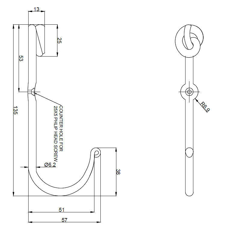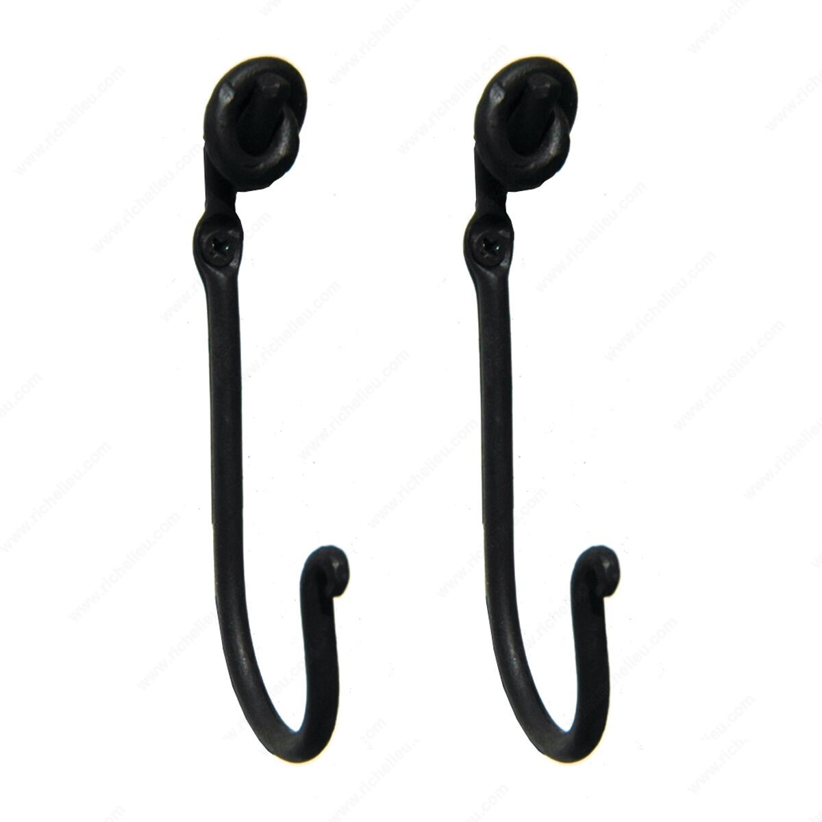 Richelieu BP79129900 Classic Forged Iron Hook - 7912 is a timeless addition to any space, combining functionality with elegant design. Crafted from durable forged iron, this classic hook features a sleek matte black finish that seamlessly complements traditional decor themes. Measuring 5 5/16 inches in height, with a projection of 2 1/4 inches and a width of 29/32 inches, it is perfectly sized for various applications, including bedrooms, bathrooms, entryways, mudrooms, and closets. With a substantial load capacity of 22 lbs, this single hook is built to handle everyday use, making it an ideal choice for hanging coats, bags, or accessories. Installation is hassle-free, as screws are included, allowing you to quickly mount it on walls or doors. Its design is inspired by architectural motifs, enhancing the aesthetic appeal of your space while providing practical storage solutions. Whether you're looking to organize your home or add a touch of sophistication, the Richelieu Classic Forged Iron Hook is the perfect blend of style and utility. Elevate your interior decor with this exquisite piece that balances elegance with everyday functionality.