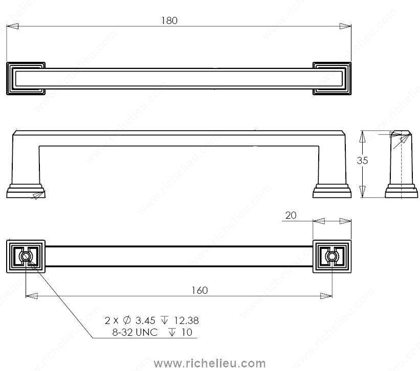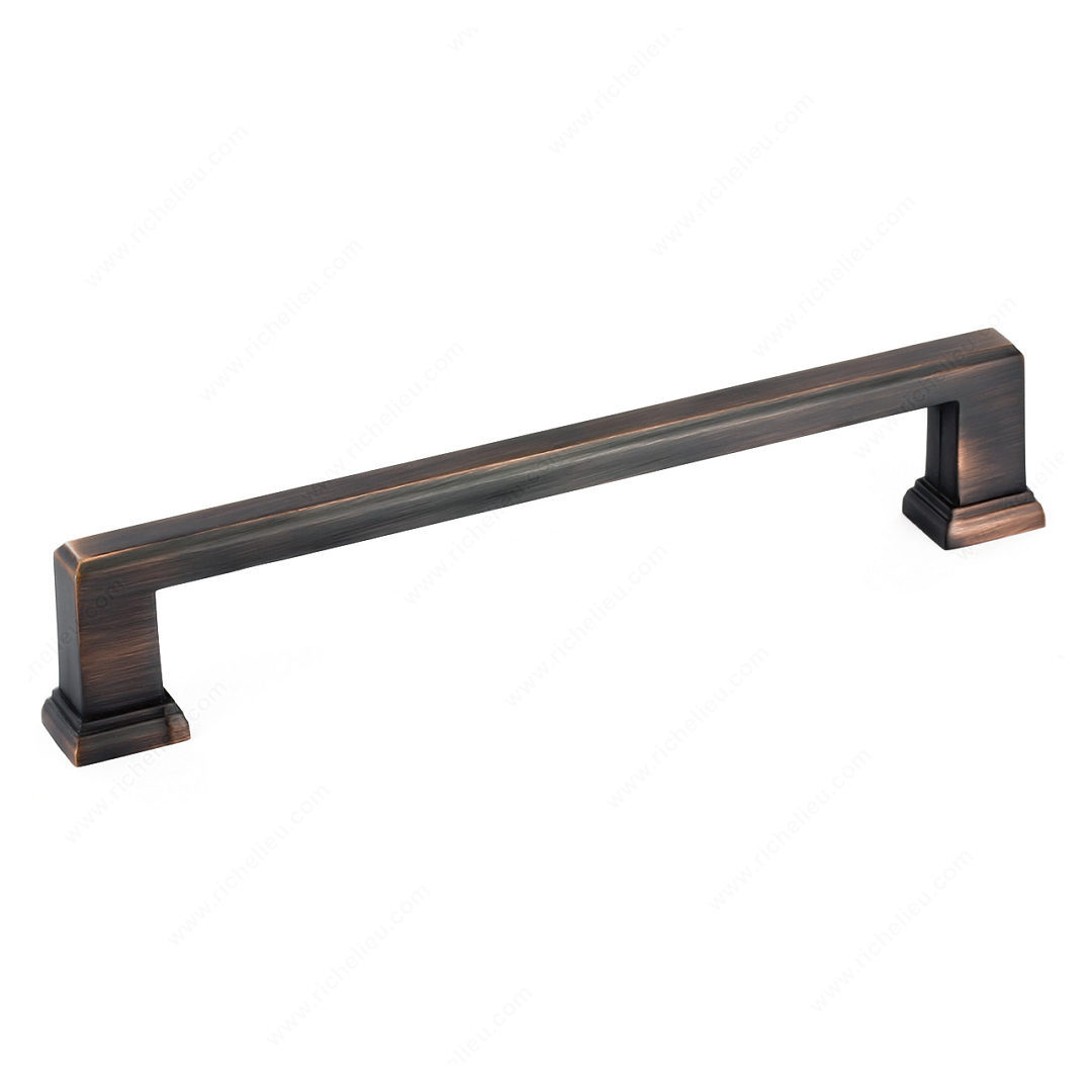 Richelieu BP795160BORB Transitional Metal Pull - 795 enhances your kitchen and bathroom décor with its sophisticated yet simple design. This pull features a rectangular shape complemented by ornamental detailing on the square base, making it a stylish addition to any cabinetry. Crafted from durable zamak, this pull combines strength with elegance, ensuring longevity and a timeless aesthetic. With a brushed oil-rubbed bronze finish, its rich brown and bronze tones add depth and character to your spaces. Measuring 7 3/32 inches in length and with a center-to-center measurement of 6 5/16 inches, this pull is designed for easy installation and a comfortable grip. The overall projection of 1 3/8 inches ensures it stands out while remaining functional. Included with your purchase are 8/32 inch screws for straightforward mounting, allowing you to upgrade your cabinetry effortlessly. The Richelieu BP795160BORB is part of the complete 795 collection, ensuring a cohesive look throughout your home. Packaged in a convenient bag, this transitional pull is ready to ship via UPS, making your renovation project even more efficient. Transform your space with this stylish and functional hardware piece that balances modern design with classic appeal.