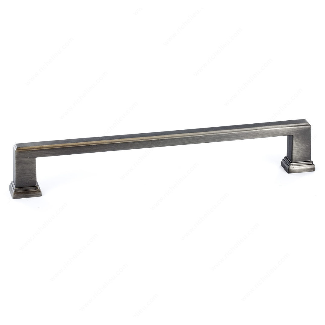 Richelieu BP795192143 Transitional Metal Pull - 795 effortlessly brings modern elegance to your kitchen and bathroom spaces. With a center-to-center measurement of 7 9/16 inches, this pull is designed for both style and functionality. The simple rectangular shape is beautifully enhanced by ornamental detailing on the square base, adding a touch of sophistication to any décor. Crafted from durable Zamak, the pull features an antique nickel finish that offers a timeless appeal, complemented by a gray and chrome color palette that fits seamlessly into various design schemes. At an overall length of 8 11/32 inches and a projection of 1 3/8 inches, it provides a comfortable grip while maintaining a sleek profile. The pull's width measures 21/32 inches, making it a versatile choice for cabinets and drawers alike. Included with the pull is an 8/32 inch screw for easy installation, and it ships conveniently via UPS. As part of the complete 795 collection, this transitional pull pairs beautifully with other pieces in the line, making it a perfect addition to your home renovation or upgrade project. Elevate your interiors with the refined style of Richelieu’s BP795192143 Transitional Metal Pull.