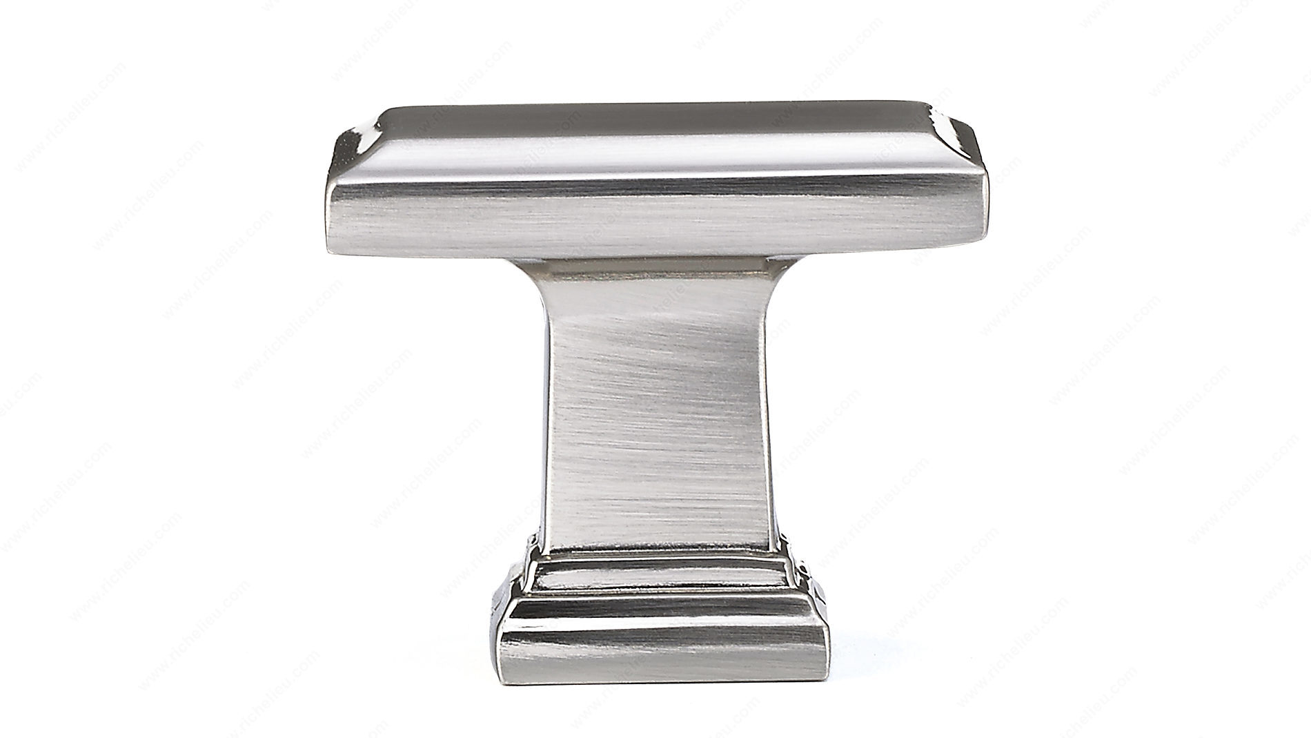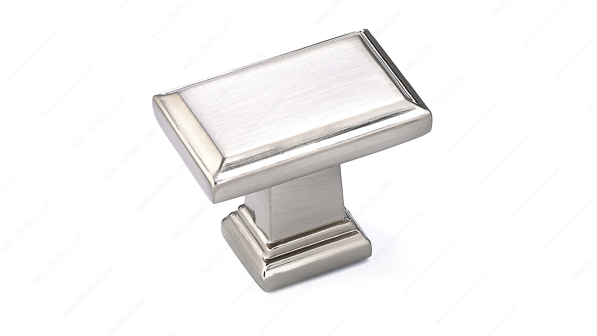 Richelieu BP79538195 Transitional Metal Knob - 7953 delivers a sophisticated touch to your kitchen and bathroom cabinetry. This transitional rectangular knob features a beautifully beveled edge and a distinctive base that enhances its elegant appearance, making it a versatile choice for various decor styles. Crafted from durable zamak, the knob is not only stylish but also built to withstand daily use. The brushed nickel finish, complemented by the chic gray and chrome color palette, adds a modern flair while ensuring long-lasting beauty and resilience. Measuring 1 1/2 inches in length, 15/16 inches in width, and with a projection of 1 1/4 inches, this knob is designed to fit comfortably in hand and provide ease of use. Installation is straightforward with the included 8/32 inch screw, making it easy to upgrade your furniture or cabinets without hassle. The BP79538195 is part of the complete collection by model 795, allowing you to create a cohesive look throughout your spaces. With its combination of style and practicality, this transitional knob is the ideal finishing touch for any renovation or new build. Elevate your interiors with Richelieu's attention to detail and quality craftsmanship.