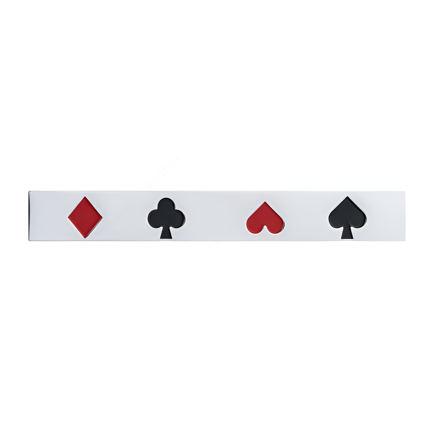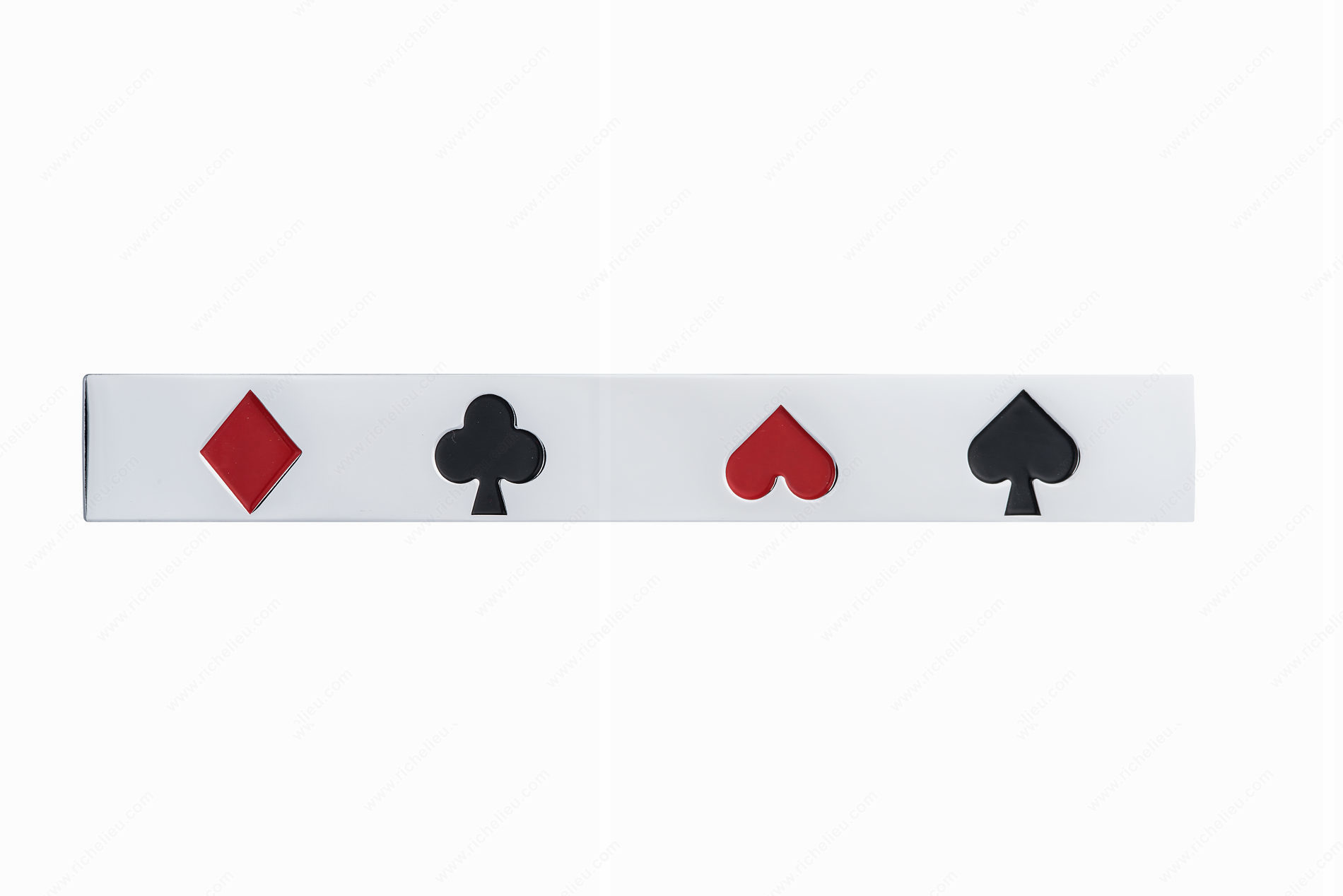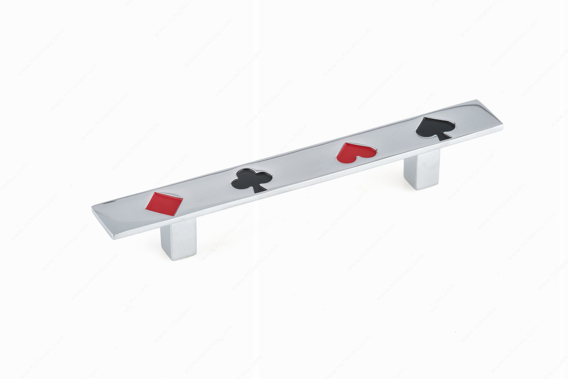 Richelieu BP797896140 Eclectic Metal Pull - 797 adds a unique flair to your game room furniture, embodying the spirit of fun and playfulness. This distinctive pull is available in two captivating designs: one side showcases all six faces of a die, while the other features the four suits of a deck of cards. Crafted from durable metal, the pull combines a sleek chrome finish with playful card game motifs, making it an eye-catching addition to any space. With overall dimensions of 6 1/32 inches in length, 3/4 inch in width, and a projection of 7/8 inch, this pull is not only stylish but also functional. The center-to-center measurement of 3 25/32 inches ensures compatibility with various cabinetry styles. Each pull comes with an 8/32 inch screw for easy installation, allowing you to update your furniture effortlessly. Available in a modern gray and chrome color scheme, the Richelieu Eclectic Metal Pull fits seamlessly into contemporary and eclectic design themes. Elevate your furniture with this playful yet sophisticated pull, perfect for adding character to drawers and cabinets in your game room or beyond.