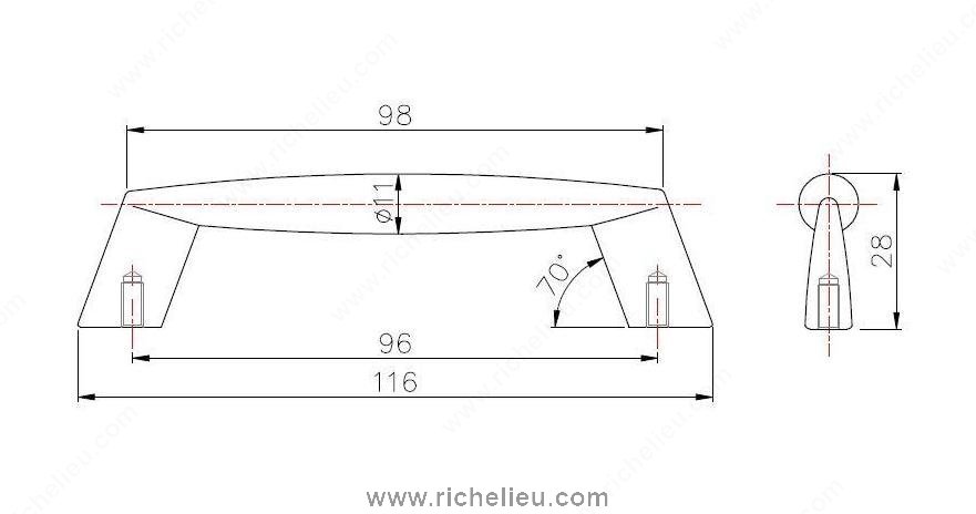 Richelieu BP80596180 Modern Metal Pull - 805 embodies contemporary design with its sleek tapered lines, making it an excellent choice for updating kitchen and bathroom décor. Crafted from durable zamak, this pull not only promises longevity but also offers a touch of sophistication with its polished nickel finish. The combination of gray and chrome hues adds a modern flair that complements a variety of interior styles. With an overall length of 4 9/16 inches and a width of 7/16 inches, this pull is designed to fit comfortably in your hand while providing a strong grip. The center-to-center measurement of 3 25/32 inches ensures compatibility with most cabinetry, making installation straightforward. Additionally, the projection of 1 3/32 inches allows for easy access without compromising space. Each pull comes with an included 8/32 inch screw for hassle-free attachment. Ideal for both residential and commercial applications, the Richelieu BP80596180 is versatile enough to enhance any setting. Easily shipped via UPS, this modern metal pull is a practical and stylish choice for those looking to elevate their space with functional hardware that marries aesthetics with performance.