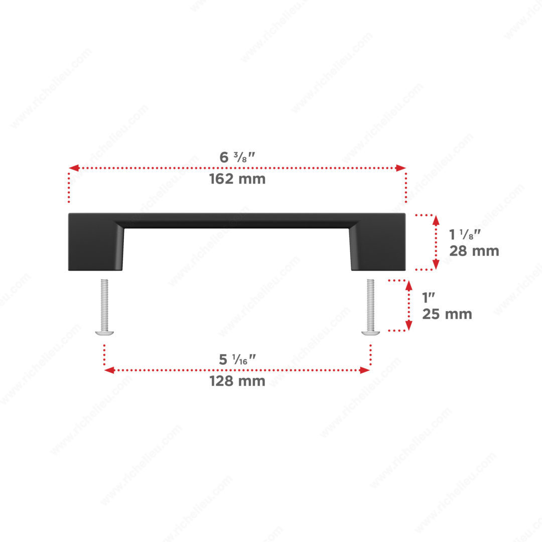 Richelieu BP8160128900 Modern Metal Pull - 8160 brings a sophisticated flair to your cabinetry with its clean, straight lines that seamlessly blend with any décor style. Crafted from durable zamak, this pull is designed for both functionality and aesthetics, making it an ideal choice for contemporary spaces. Available in a striking matte black finish, the BP8160128900 is offered in a variety of center-to-center options, including 12- and 18-inch appliance pulls. The 1-1/4 inch handle can double as a knob, providing versatility in your design choices. Its overall dimensions measure 6 3/8 inches in length, with a projection of 1 3/32 inches and a width of 5/16 inches, ensuring a comfortable grip while maintaining a streamlined appearance. This modern pull is part of Richelieu’s new collection, allowing you to mix and match with other pieces for a cohesive look. Included with the purchase are screws (8/32 in x 25 mm) for easy installation. Whether you’re updating a kitchen, bathroom, or any cabinetry, the Richelieu BP8160128900 Modern Metal Pull is the perfect finishing touch that combines style and practicality.