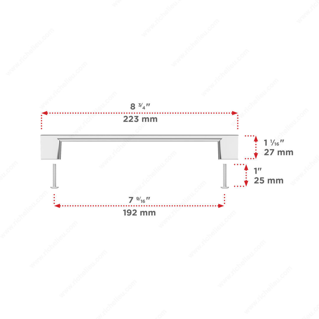 Richelieu BP8160192140 Modern Metal Pull - 8160 offers a sophisticated accent for your cabinetry with its sleek design and contemporary appeal. Crafted from durable Zamak, this pull features a simple, straight-line construction that seamlessly blends with any décor style, enhancing the aesthetic of kitchens, bathrooms, or living spaces. Measuring 8 25/32 inches in overall length and with a center-to-center distance of 7 9/16 inches, this pull is versatile enough to suit various applications, including as an appliance pull in both 12- and 18-inch options. The 1-1/4 inch handle can also serve as a knob, providing flexibility in design choices. Available in multiple finishes, including a striking chrome finish (Finish Number: 140), it complements any color scheme beautifully. Each pull comes packaged in a convenient bag, and screws (8/32 in x 25 mm) are included for easy installation. With its modern style and superior craftsmanship, Richelieu BP8160192140 is not just a functional piece but a statement accessory for any space. Elevate your cabinets and drawers with this refined hardware from Richelieu's New Collection, ensuring a polished look that lasts.
