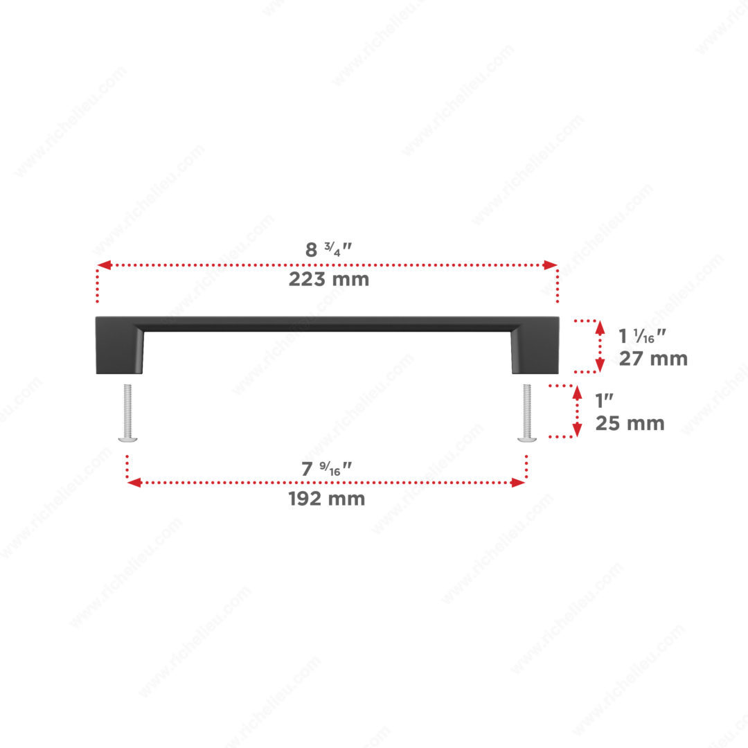 Richelieu BP8160192900 Modern Metal Pull – 8160 seamlessly combines style and functionality, making it an ideal choice for enhancing your cabinet doors and drawer fronts. Designed with simple, straight lines, this pull integrates effortlessly into various décor styles, from contemporary to traditional. Crafted from durable Zamak, the pull features a sleek matte black finish that adds an elegant touch to any space. With an overall length of 8 25/32 inches and a projection of 1 1/16 inches, it provides a comfortable grip while maintaining a low-profile aesthetic. The 1-1/4 inch (32 mm) handle can be utilized as a knob, or paired with a matching finish knob available in the suggested products for a cohesive look. The model 8160 is available in multiple center-to-center options, including 7 9/16 inches, as well as 12- and 18-inch appliance pulls, ensuring versatility to suit your specific needs. Each pull comes with an 8/32 inch x 25 mm screw for easy installation. Packaged for convenient shipping via UPS, the Richelieu Modern Metal Pull is not just a functional hardware piece; it’s a stylish upgrade that enhances the overall appeal of your cabinetry.