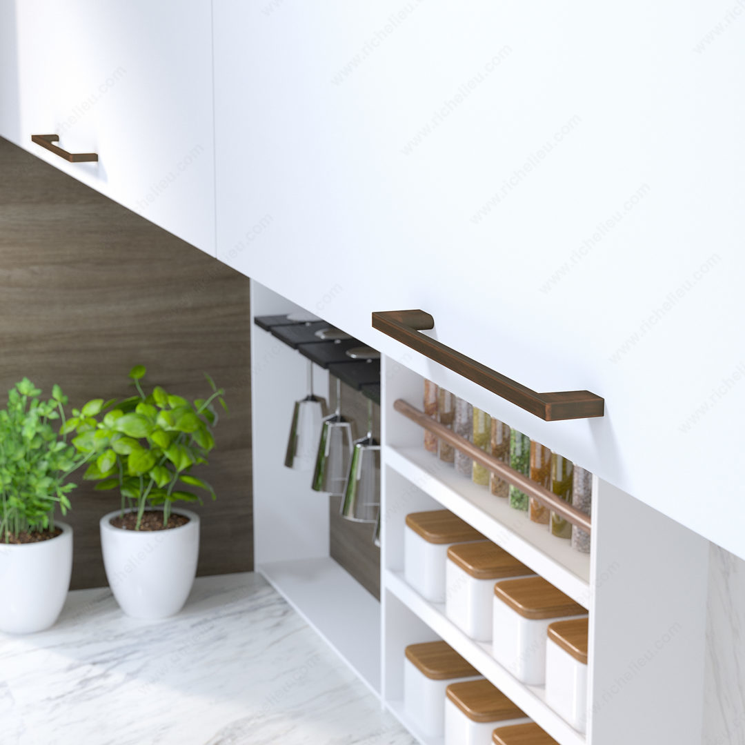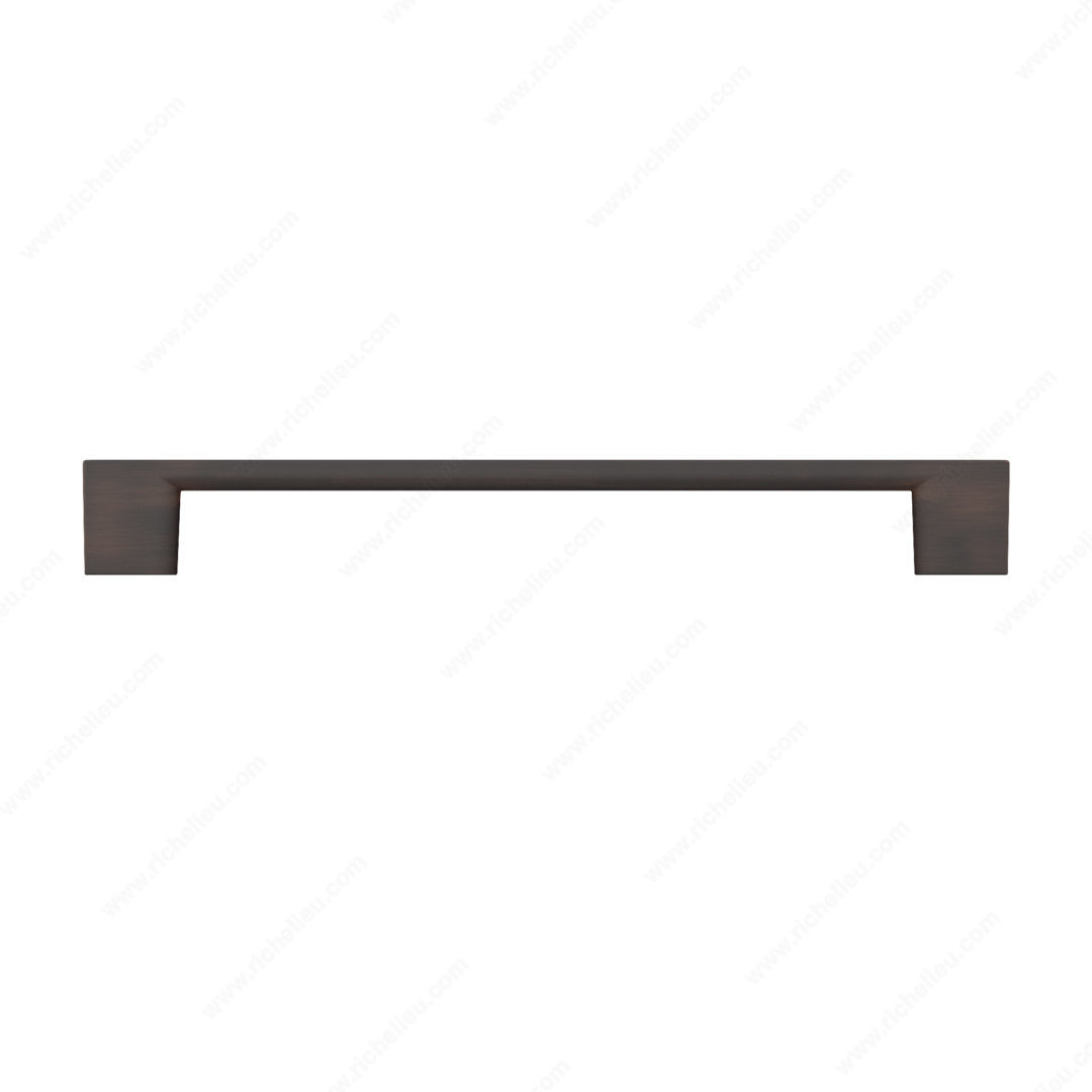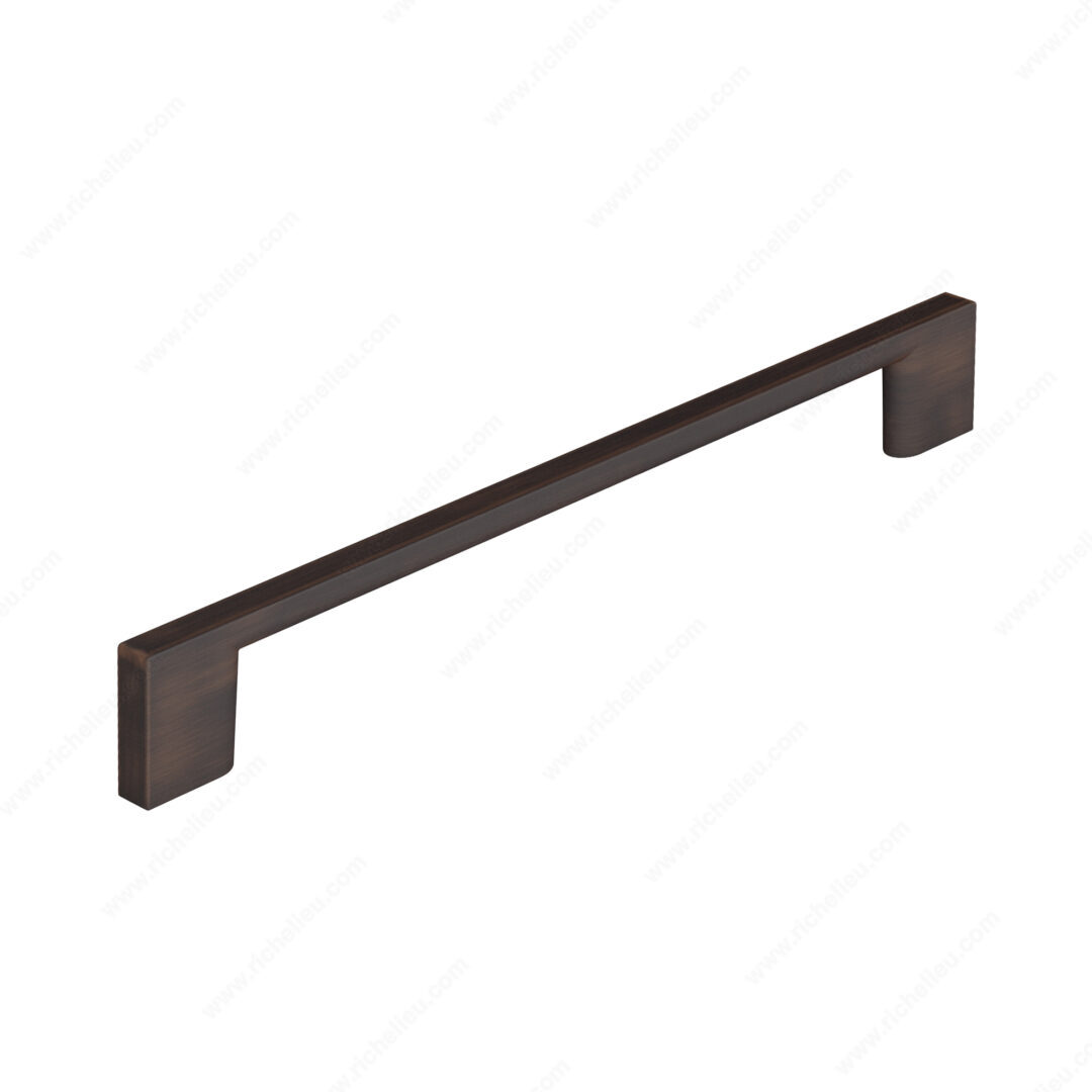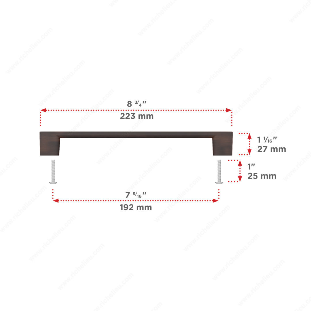 Richelieu BP8160192BORB Modern Metal Pull - 8160 is a sophisticated addition to your cabinetry, designed to elevate the aesthetics of both cabinet doors and drawer fronts. This pull showcases a sleek, modern style with simple, straight lines that seamlessly integrate into any décor, making it a versatile choice for various design themes. Available in a stunning Brushed Oil-Rubbed Bronze finish, this pull not only enhances visual appeal but also offers durability thanks to its construction from high-quality Zamac material. With an overall length of 8 25/32 inches and a center-to-center measurement of 7 9/16 inches, it is perfectly sized for most applications. The pull's width measures 11/32 inches and projects 1 1/16 inches, providing a comfortable grip. Richelieu’s model 8160 comes in eight finishes, including 12- and 18-inch appliance pulls, allowing for customization across your cabinetry. This model can also be paired with matching knobs for a cohesive look, available in suggested products. Installation is simple with included 8/32 inch x 25 mm screws. Add a touch of elegance and sophistication to your space with the Richelieu BP8160192BORB Modern Metal Pull - 8160, a perfect blend of style and functionality.