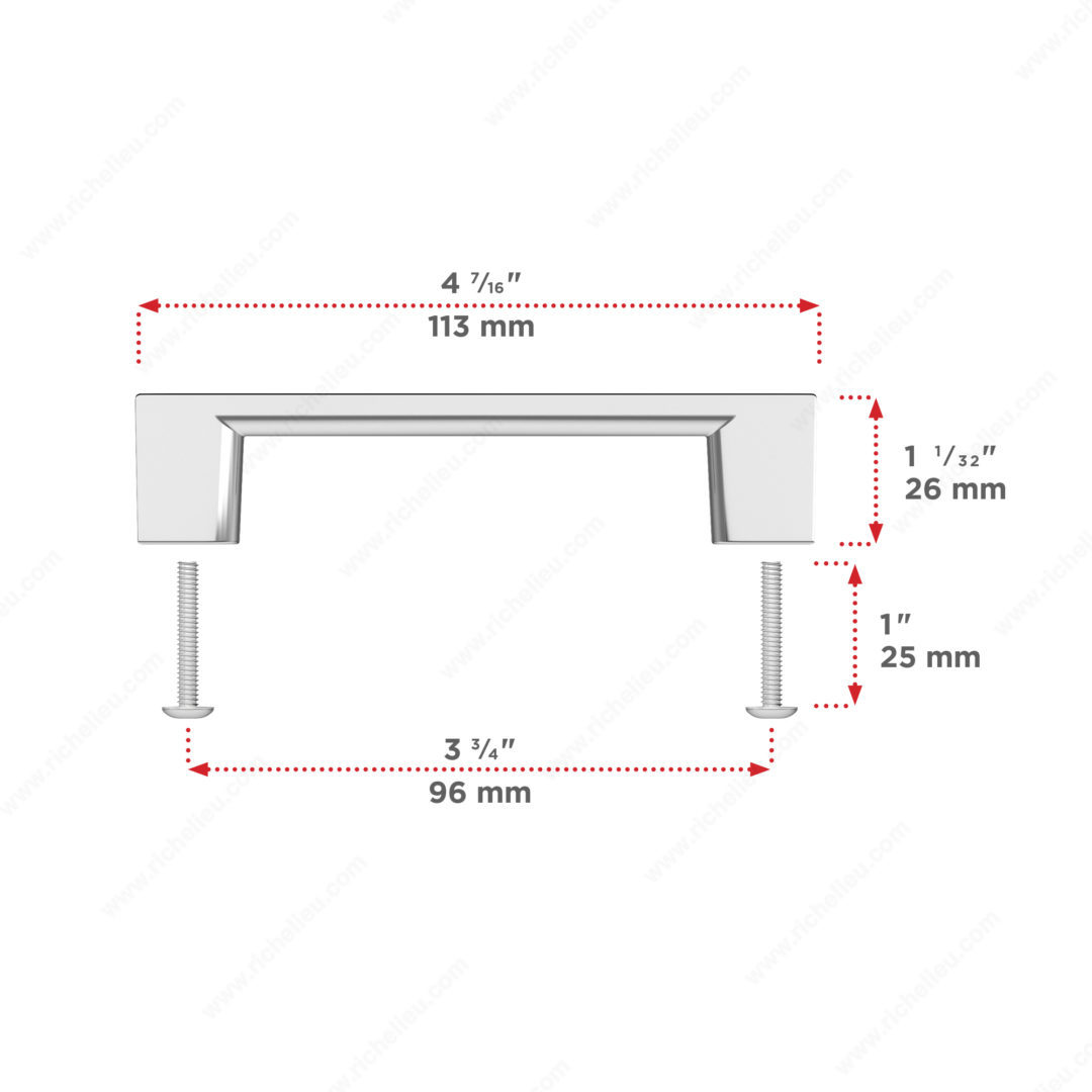 Richelieu BP816096140 Modern Metal Pull - 8160 offers a refined touch to your cabinetry, resulting in an eye-catching enhancement for both contemporary and traditional spaces. With its sleek, straight lines, this pull seamlessly integrates into any décor, elevating the aesthetic of kitchen cabinets and drawer fronts alike. Crafted from durable Zamak material, the BP816096140 is not only stylish but also built to withstand daily use. Measuring 4 7/16 inches in length, it features a center-to-center measurement of 3 25/32 inches, making it an ideal choice for a variety of applications. The pull’s projection of 1 1/32 inches provides a comfortable grip while maintaining a low-profile appearance. Available in eight elegant finishes, including a striking chrome option, you can easily find the perfect match for your design vision. The 1-1/4 inch handle can serve as a knob, or pair it with a matching finish knob for added versatility. Each package includes necessary screws, ensuring quick and easy installation. Richelieu's BP816096140 Modern Metal Pull is part of a new collection that emphasizes both function and style, making it a must-have for any renovation or new build project.