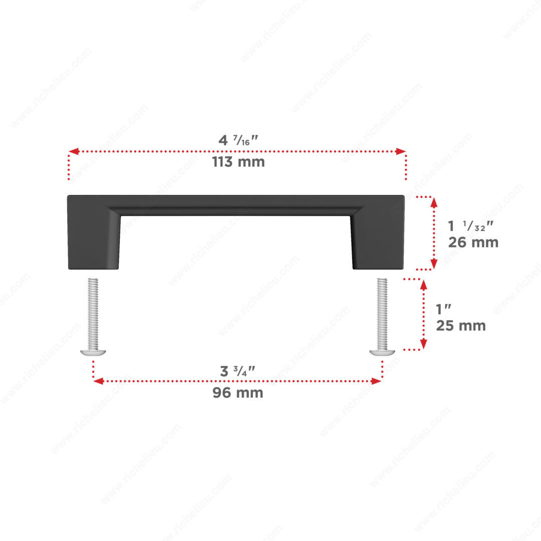 Richelieu BP816096900 Modern Metal Pull - 8160 brings a refined elegance to your cabinetry with its sleek, contemporary design. This pull features simple, straight lines that seamlessly integrate with various décor styles, making it an ideal choice for both modern and traditional spaces. Crafted from durable Zamak, this pull showcases a stunning matte black finish that not only enhances its aesthetic appeal but also promises longevity. Measuring 4 7/16 inches in length with a projection of 1 1/32 inches, the pull offers a comfortable grip while maintaining a low-profile appearance. It is available in multiple center-to-center options, including 12- and 18-inch appliance pulls, accommodating diverse kitchen designs. The 1-1/4 inch (32 mm) handle can be used as a knob, and a matching knob in the same finish is available for a coordinated look. The product is part of Richelieu's new collection and ships conveniently via UPS, ensuring it arrives securely packaged in a bag. With a width of 5/16 inch and a screw size of 8/32 inches x 25 mm included, the installation process is straightforward. Elevate your cabinetry with the Richelieu BP816096900 Modern Metal Pull - 8160, where functionality meets sophisticated design.