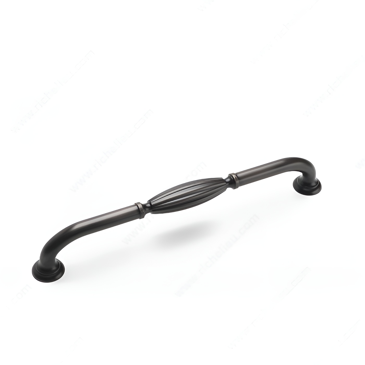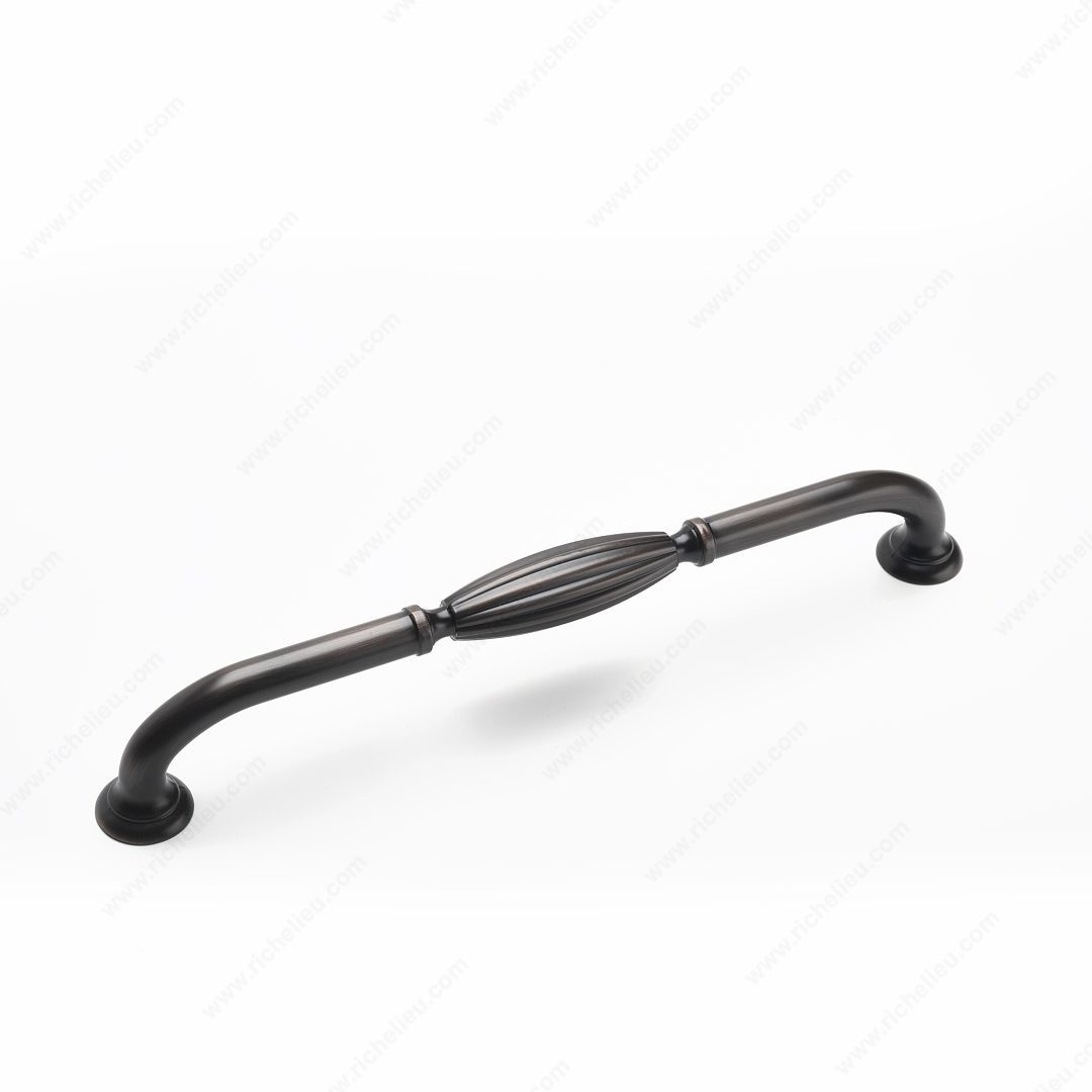 Richelieu BP82718BORB Traditional Metal Appliance Pull - 8271 is a stunning addition to any kitchen or cabinetry design. Featuring a sophisticated fluted center and elegantly arched ends, this pull embodies timeless elegance, making it an ideal choice for refrigerators, pantry doors, wide drawers, or tall cabinets. Crafted from durable zamak, it ensures longevity and is finished in a beautiful brushed oil-rubbed bronze (BORB) that complements a variety of décors. Measuring 13 1/4 inches in length with a center-to-center distance of 12 inches, this appliance pull fits seamlessly into standard installations. Its overall projection of 2 5/32 inches offers a comfortable grip, while a width of 1 1/16 inches ensures it remains unobtrusive yet stylish. The pull comes complete with M6 screws for easy installation, packaged conveniently in a bag for efficient handling. Whether you're upgrading an existing space or designing new cabinetry, the Richelieu BP82718BORB combines functionality with aesthetic appeal, making it a perfect choice for building professionals and discerning homeowners alike. Add a touch of classic charm to your interiors with this exquisite appliance pull.