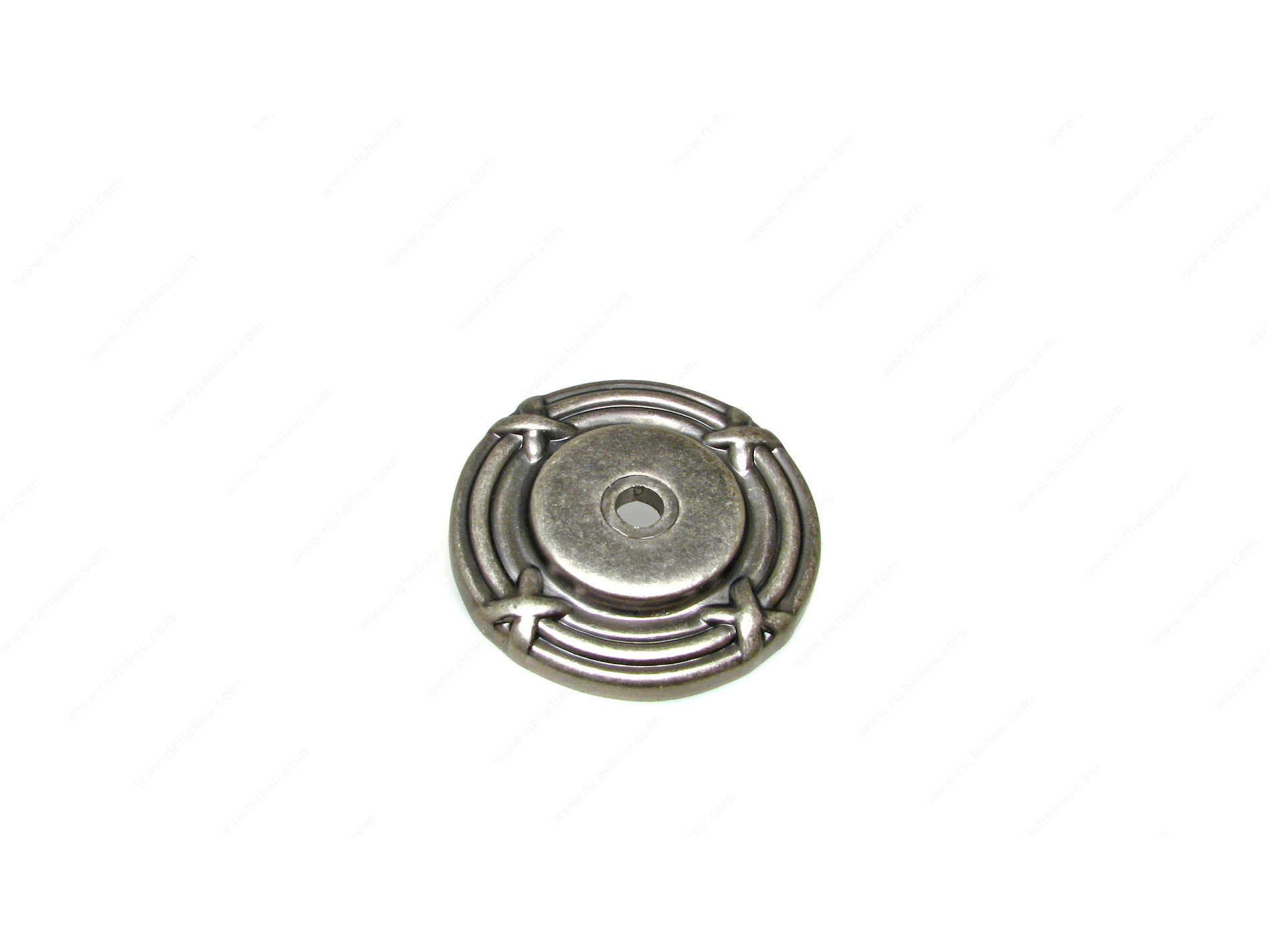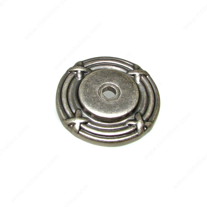 Richelieu BP82917142 Traditional Metal Rosette for Knob - 8291 is an elegant backplate that enhances the aesthetic appeal of cabinet knobs. Crafted from durable zamak, this backplate showcases a classic design with subtle embellishments, making it an ideal addition to both kitchen and bathroom cabinetry. Measuring 1 1/2 inches in diameter and featuring a projection of 3/16 inches, the BP82917142 provides a perfect backdrop for your traditional-style pulls and knobs. The pewter finish, designated with the finish number 142, exudes a sophisticated gray and chrome color palette that complements various decor styles. Designed for easy installation, this decorative backplate can ship via UPS, ensuring prompt delivery to your project site. Its timeless design not only adds a customized touch but also serves as a practical solution to cover any existing blemishes on cabinet surfaces. Whether you're renovating a space or finishing a new project, the Richelieu Traditional Metal Rosette offers both functionality and style, making it a must-have for building professionals and discerning homeowners alike. Elevate your cabinetry with this exquisite piece that harmonizes elegance and tradition seamlessly.