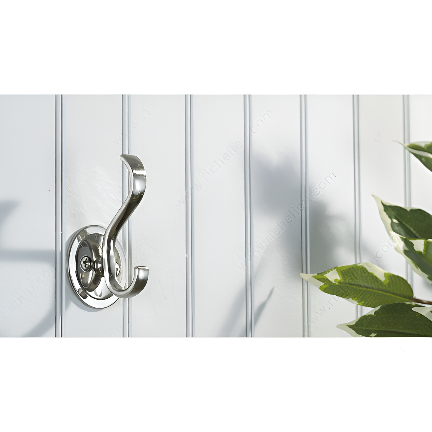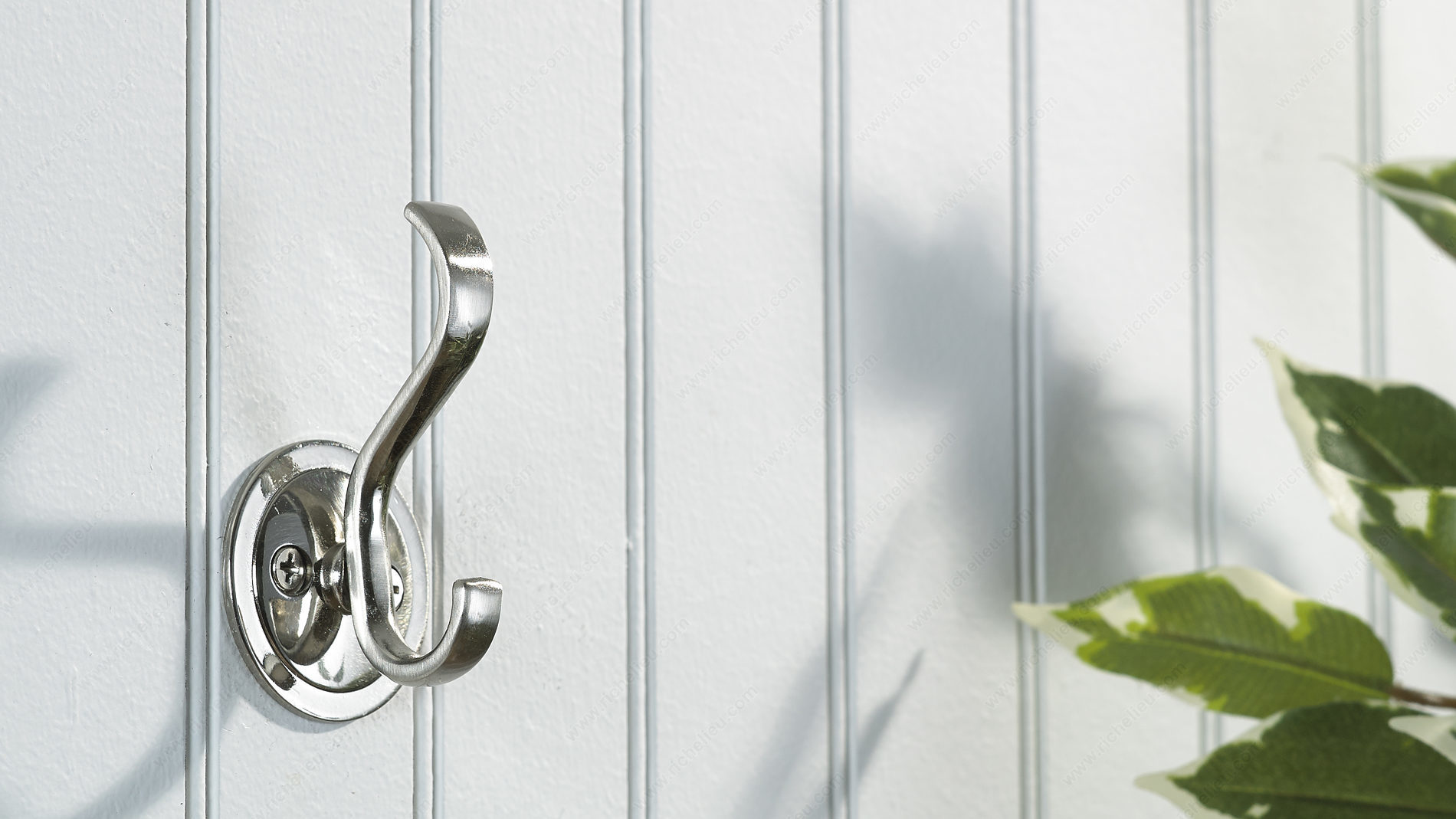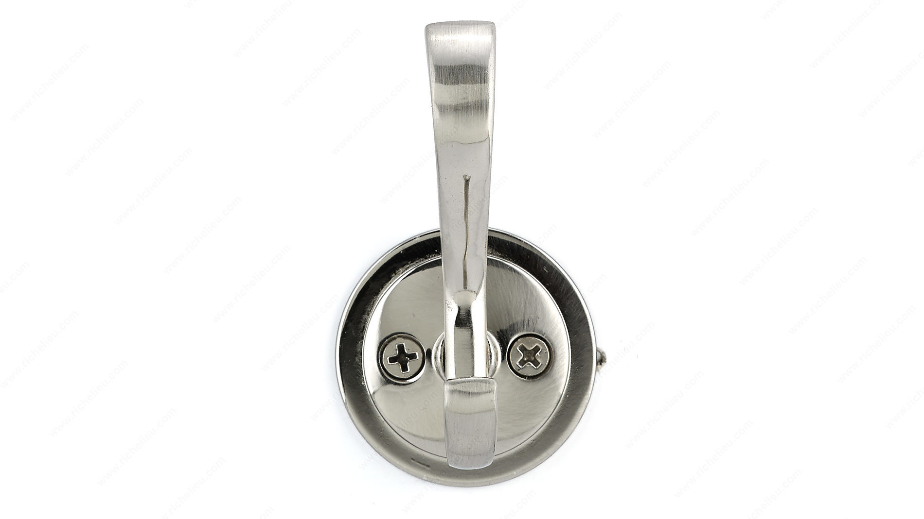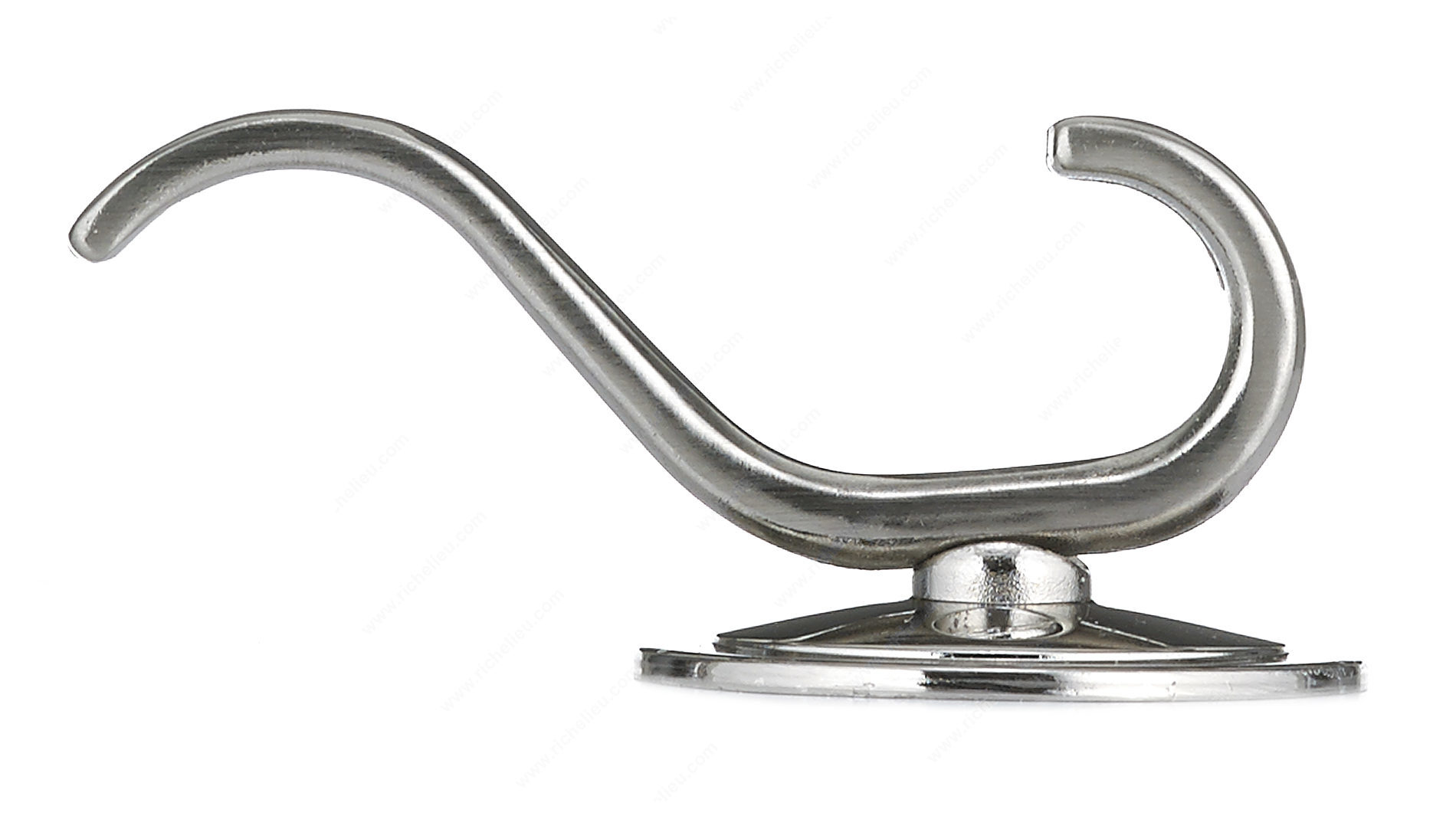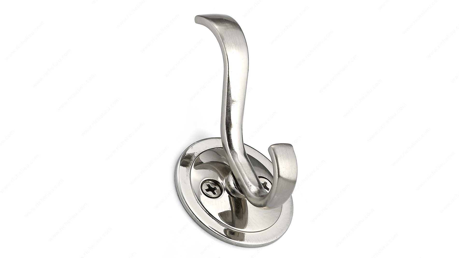 Richelieu BP84025195 Classic Metal Hook - 840 offers an elegant touch to any space with its traditional curves and brushed nickel finish. Designed as a double hook, this classic model is not only stylish but also highly functional, making it a perfect addition to entryways, hallways, or bathrooms. With an overall height of 3 1/8 inches and a width of 1 25/32 inches, this hook provides a compact yet sturdy solution for hanging coats, bags, or towels. The hook has a load capacity of 22 pounds, ensuring it can handle everyday use with ease. Its projection of 1 13/32 inches keeps items conveniently within reach without taking up excessive space. Available in a sophisticated gray and chrome color scheme, the Richelieu Classic Metal Hook seamlessly blends with various interior designs. The package includes screws for easy installation, allowing you to quickly set it up and start enjoying its practical benefits. Whether you're looking to enhance the first impression of your entryway or add functional charm to your home, the Richelieu BP84025195 Classic Metal Hook is an excellent choice for both building professionals and discerning homeowners.