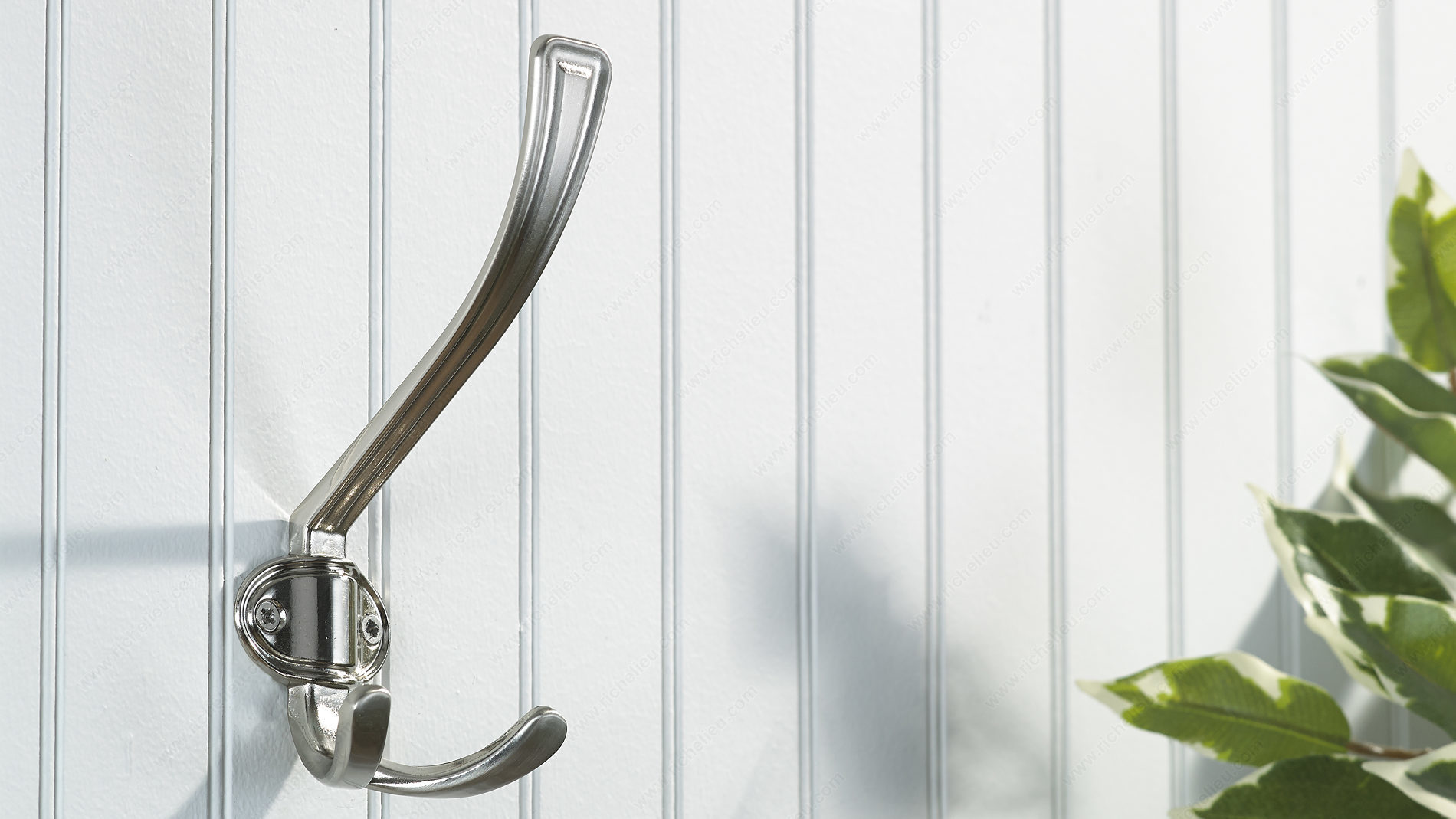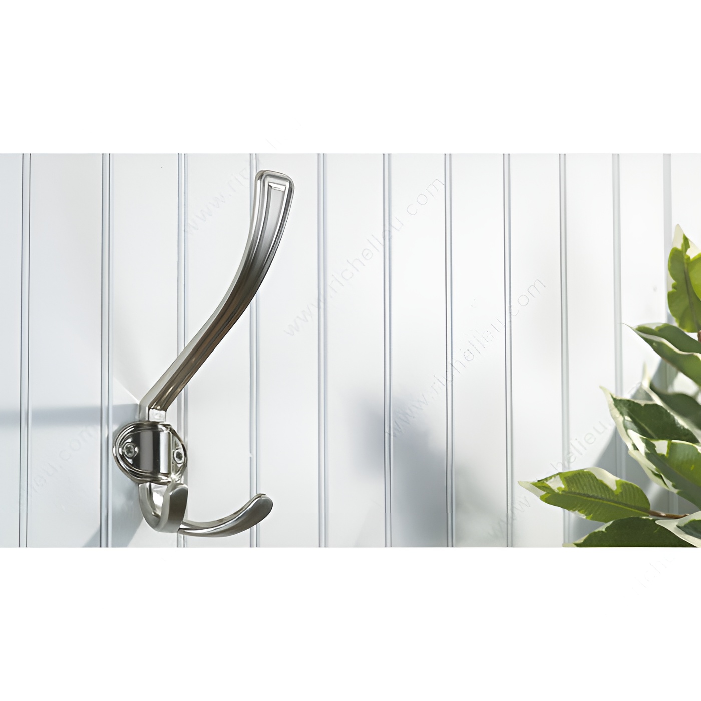 Richelieu BP84032195 Classic Metal Hook - 8403 offers a sophisticated solution for enhancing storage potential in any room. Designed with an elegant brushed nickel finish, this hook not only serves a functional purpose but also adds a bold statement to your decor. With an overall height of 6 1/2 inches and a width of 2 21/32 inches, it is perfectly sized to accommodate various garments without overwhelming your space. This multiple hook model features a classic design that complements a wide range of interior styles. The hook has a robust load capacity of 22 pounds, making it ideal for hanging coats, bags, and other clothing items securely. The 1 1/4-inch center-to-center spacing ensures that you can position multiple hooks conveniently side by side, maximizing your storage options. Constructed from durable metal, the Richelieu BP84032195 is built to withstand daily use. The package includes screws for easy installation, allowing you to integrate this stylish hook into your home effortlessly. With a projection of 3 1/8 inches, it maintains a low profile while providing ample hanging space. Elevate your organization and style with this versatile classic hook from Richelieu, perfect for both building professionals and discerning homeowners.