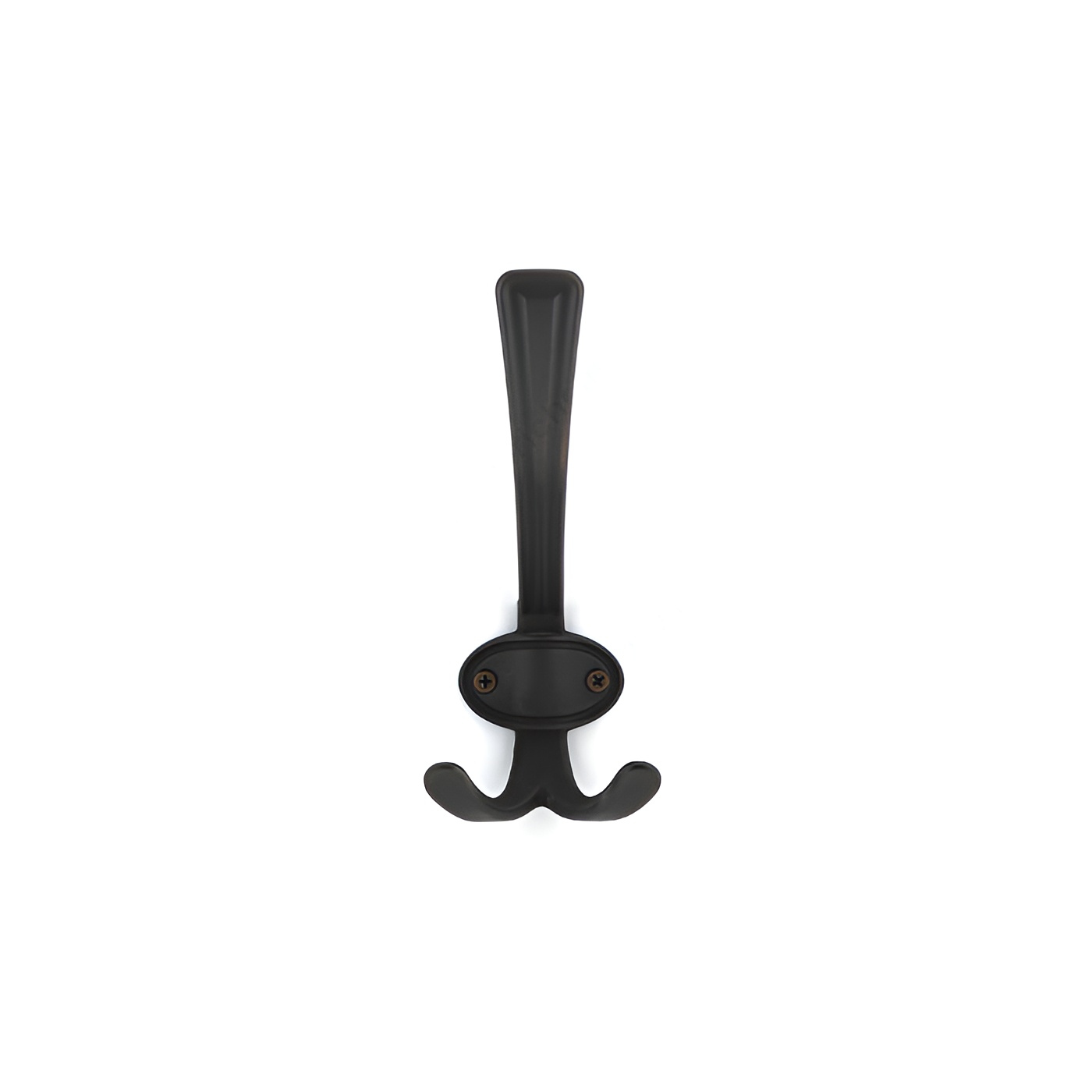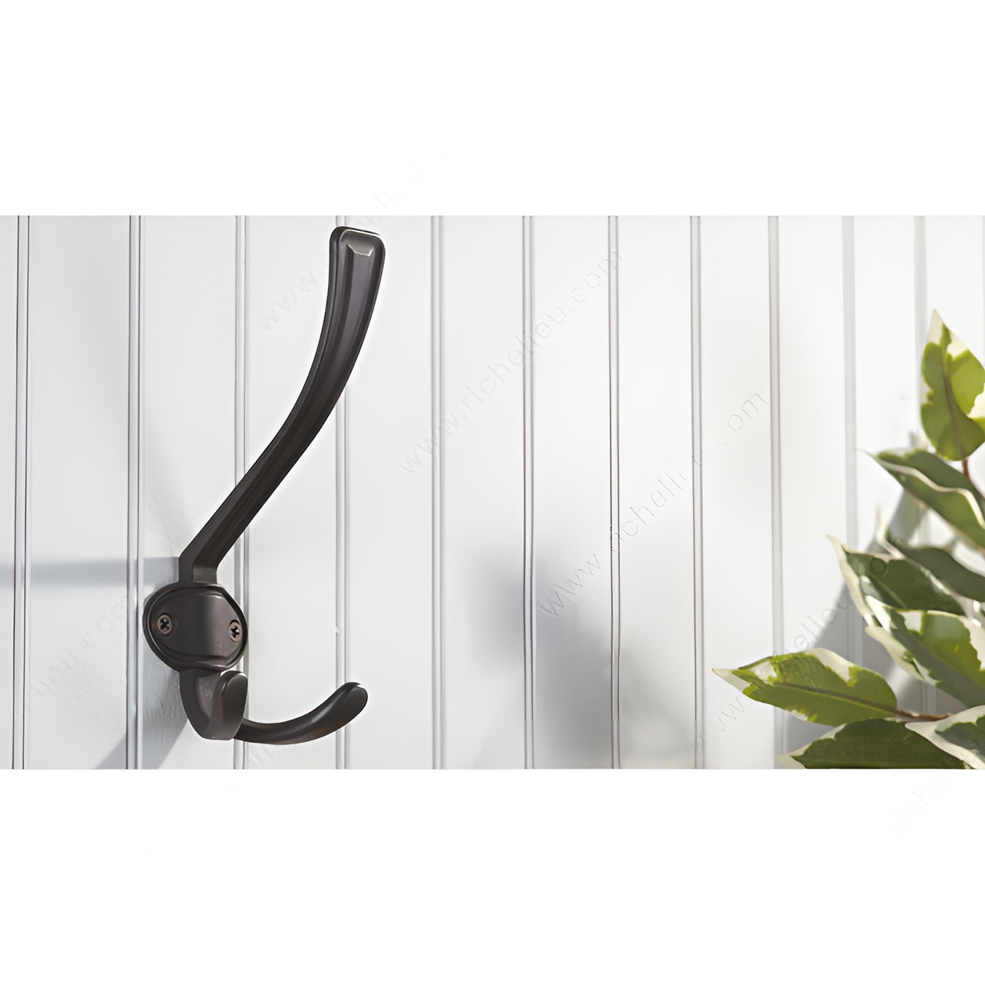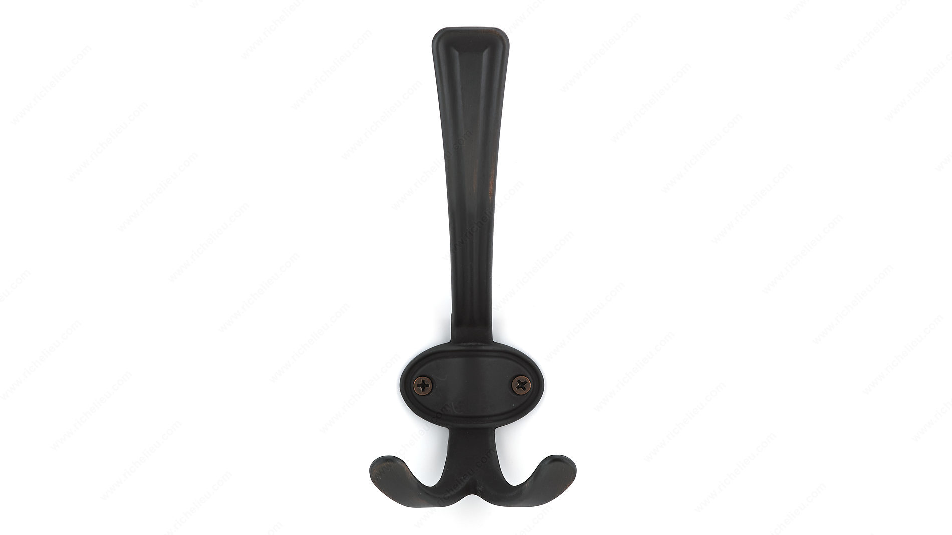 Richelieu BP84032BORB Classic Metal Hook - 8403 offers a sophisticated solution for maximizing clothing storage while enhancing your space's aesthetics. This elegant hook is designed to accommodate a variety of settings, from entryways to bathrooms, making it a versatile addition to any room. Crafted from durable metal with an oil-rubbed bronze finish, this hook not only exudes a timeless charm but also ensures long-lasting performance. With a load capacity of 22 pounds, it is robust enough to hold coats, bags, or towels securely, providing functionality without sacrificing style. The hook's overall dimensions include a height of 6 1/2 inches, a width of 2 21/32 inches, and a projection of 3 1/8 inches, allowing it to fit seamlessly into your existing decor. Installation is straightforward, as screws are included for your convenience. The hook features a classic design with a center-to-center distance of 1 1/4 inches, making it suitable for various applications. Available in an appealing gray and chrome color scheme, the Richelieu BP84032BORB Classic Metal Hook is an ideal choice for professionals and homeowners alike seeking both style and practicality in their hardware solutions.