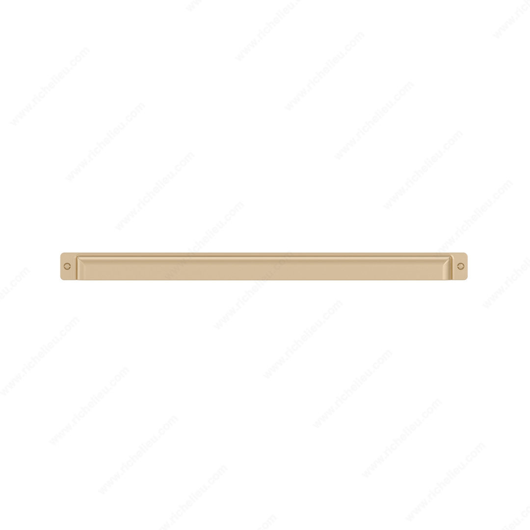 Richelieu BP8716480CHBRZ Transitional Metal Pull - 8716 offers a sophisticated touch to any cabinetry with its stylish design and practical functionality. This rectangular cup pull features faux screw embellishments, enhancing its aesthetic appeal while maintaining a sleek profile. Measuring 19 5/8 inches in overall length, the pull is available in a trendy Champagne Bronze finish, allowing it to complement various décor styles seamlessly. Designed for ease of installation, this cup pull requires milling 7 mm into the panel, ensuring a flush fit that adds a polished look to your kitchen or furniture pieces. With a center-to-center measurement of 18 7/8 inches, it is versatile enough to fit a wide range of applications. Made from durable Zamak material, this pull is not only visually striking but also built to withstand daily use. The overall dimensions of the pull include a projection of 1 11/32 inches and a width of 15/16 inches, making it comfortable to grip while also providing a contemporary flair. Each pull comes with 8/32 inch screws included for straightforward installation. Upgrade your cabinetry with the Richelieu BP8716480CHBRZ and enjoy a blend of style and functionality that enhances your space.