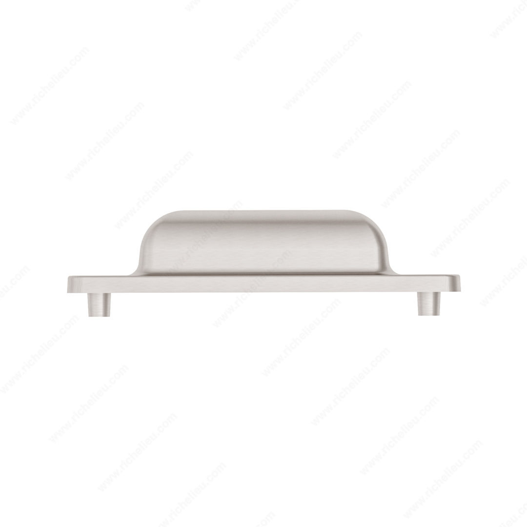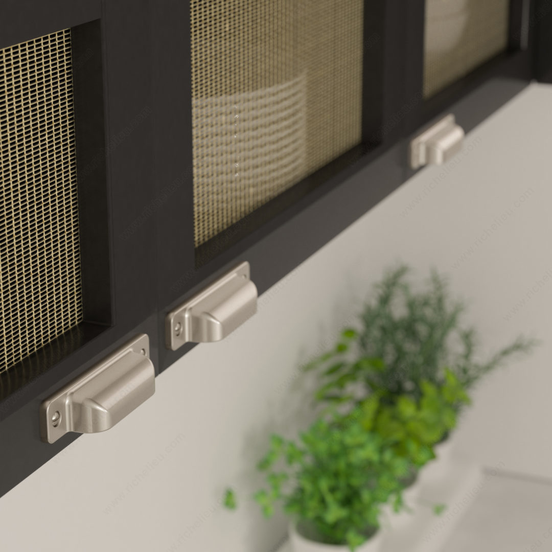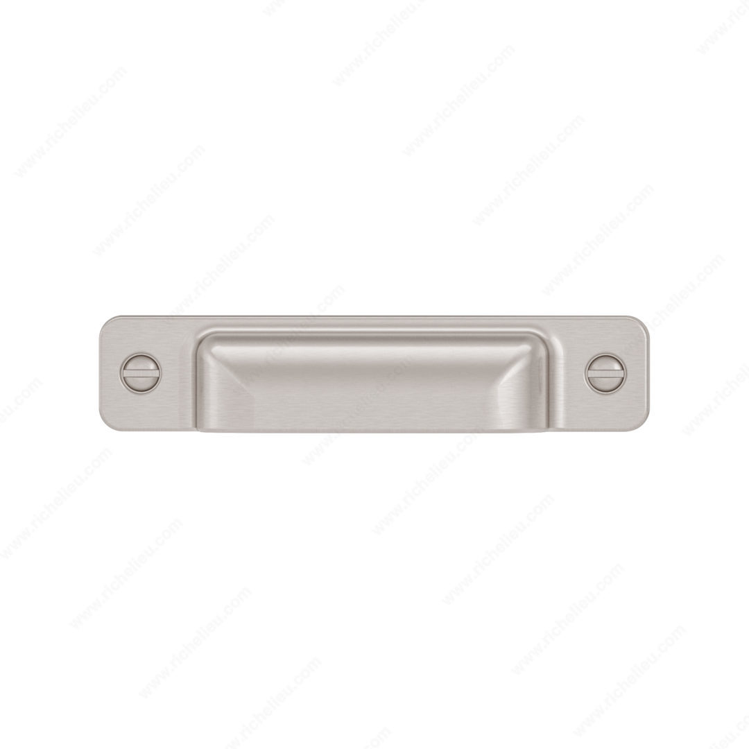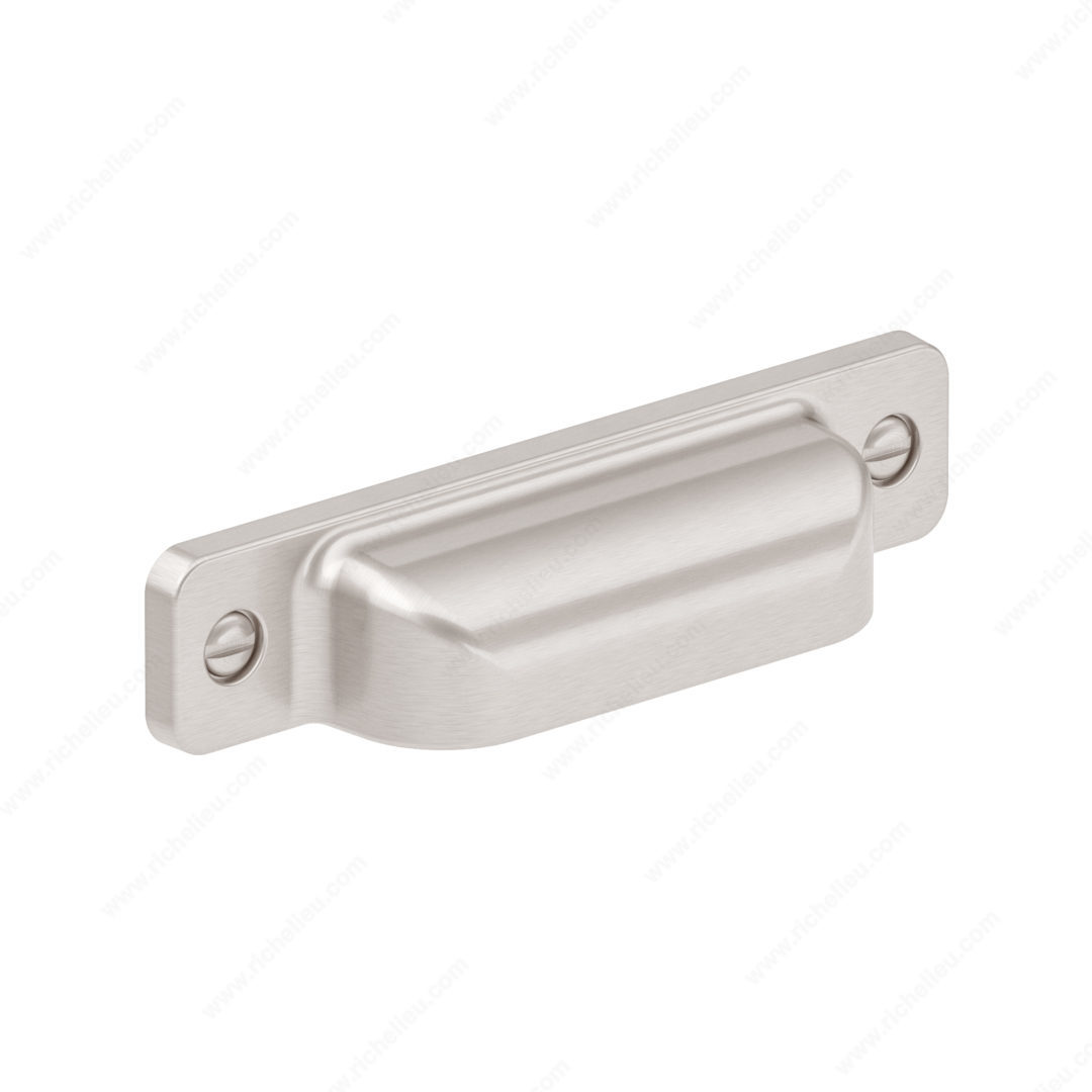 Richelieu BP871696195 Transitional Metal Pull - 8716 combines practicality with a stylish design, making it a perfect addition to modern cabinetry. This rectangular cup pull features faux screw embellishments that elevate its aesthetic while ensuring a secure grip for easy opening of drawers and cabinets. Available in various lengths, the pull is designed to accommodate a milling depth of 7 mm, allowing it to sit flush against the panel for a seamless look. Crafted from durable Zamak material, the BP871696195 is finished in a sophisticated brushed nickel, adding a touch of elegance to any space. With an overall length of 4 1/2 inches, a projection of 15/16 inches, and a width of 15/16 inches, this pull is both functional and visually pleasing. The center-to-center measurement of 3 25/32 inches ensures compatibility with a wide array of cabinetry styles. This cup pull is part of Richelieu's new collection and can be shipped via UPS for your convenience. Included with the pull are 8/32 inch screws for easy installation. Enhance your kitchen or furniture with this stylish and functional hardware solution that perfectly balances contemporary design with everyday usability.
