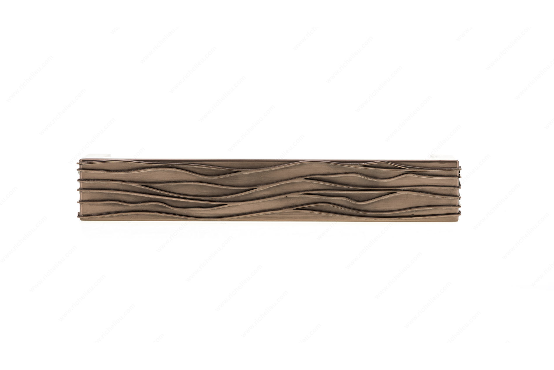 Richelieu BP8717128HBRZ Modern Metal Pull - 8717 features a captivating wavy textured pattern that adds a touch of sophistication to furniture and cabinetry. This modern pull, part of the New Collection, measures 5 1/2 inches in overall length with a center-to-center distance of 5 1/32 inches, making it an ideal choice for a variety of applications. Crafted from durable metal, the pull showcases a rich Honey Bronze finish that beautifully contrasts with the brown and bronze tones, lending a warm and inviting feel to any space. With dimensions of 29/32 inch in width and a projection of 1 13/32 inches, it is designed to provide both functionality and aesthetic appeal. Installation is straightforward, with included 8/32 inch screws ensuring a secure fit. This pull is not only suitable for kitchen cabinets but also enhances the look of dressers, desks, and other furniture pieces, making it a versatile addition to your design toolkit. Richelieu's commitment to quality is evident in this pull, offering a perfect blend of style and practicality that meets the needs of both building professionals and discerning homeowners. Elevate your cabinetry and furniture with the distinctive charm of the BP8717128HBRZ pull.
