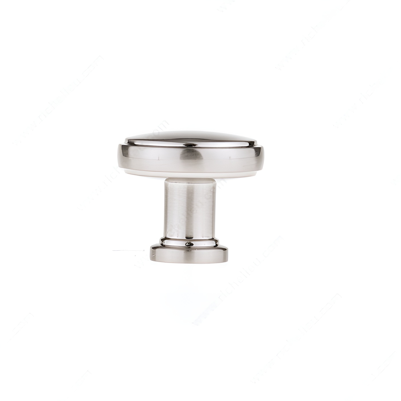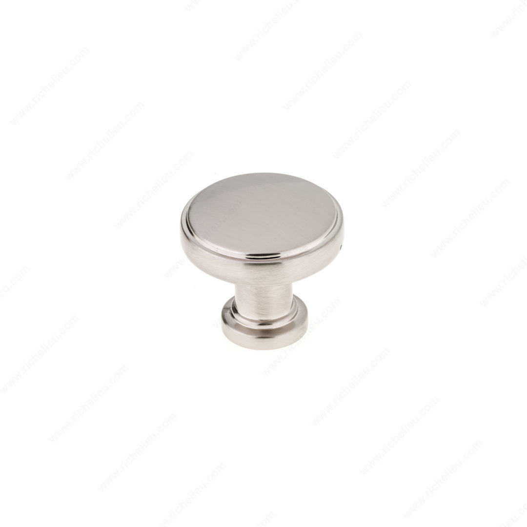 Richelieu BP872634195 Modern Metal Knob - 8726 offers a sophisticated touch to any cabinetry with its unique and refined design. This knob features a smooth surface that elegantly transitions into a slightly elevated center, complemented by a stepped base. Crafted from durable Zamak, it combines strength with modern aesthetics, making it an ideal choice for contemporary spaces. With an overall diameter of 1 11/32 inches and a base diameter of 23/32 inches, this knob is perfectly sized for ease of use while maintaining a sleek profile. The brushed nickel finish adds a subtle sheen, enhancing its gray and chrome color palette, and ensuring it blends seamlessly with various décor styles. Installation is straightforward, with an included 8/32 inch screw for hassle-free mounting. The knob projects 1 3/16 inches, providing a comfortable grip and functionality. As part of Richelieu's New Collection, this model embodies modern design principles while delivering the quality associated with Richelieu products. Ideal for kitchen cabinets, bathroom vanities, or furniture pieces, the Richelieu BP872634195 Modern Metal Knob serves as a stylish accent that enhances both form and function in your home or professional projects.