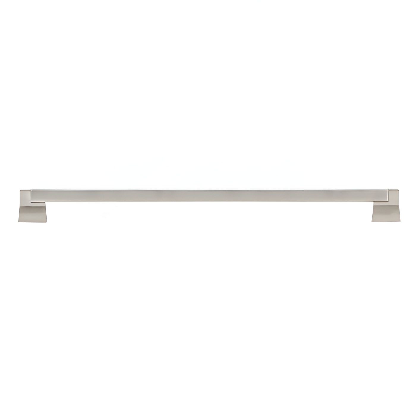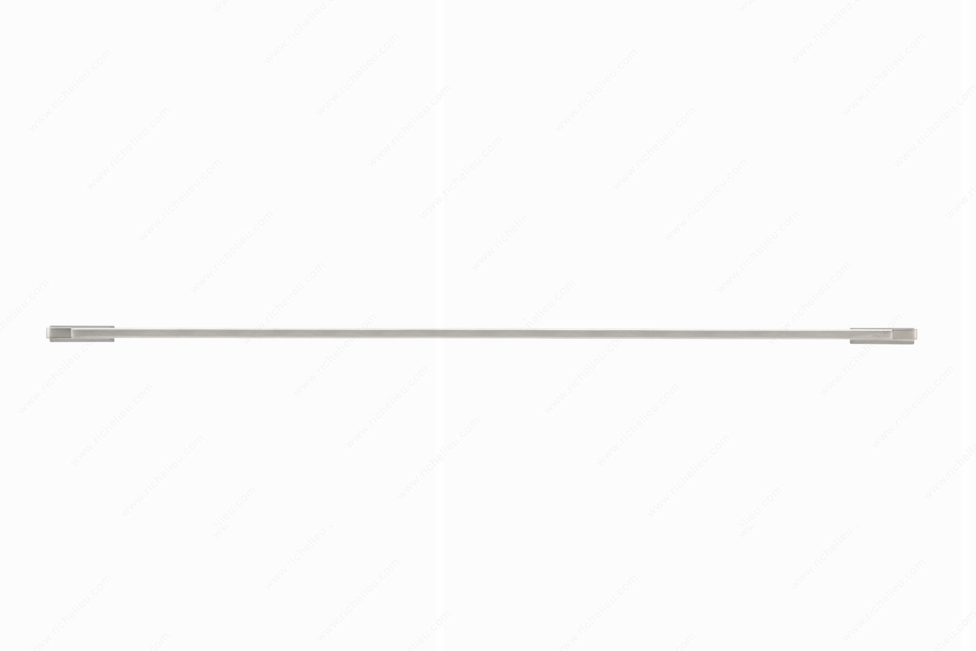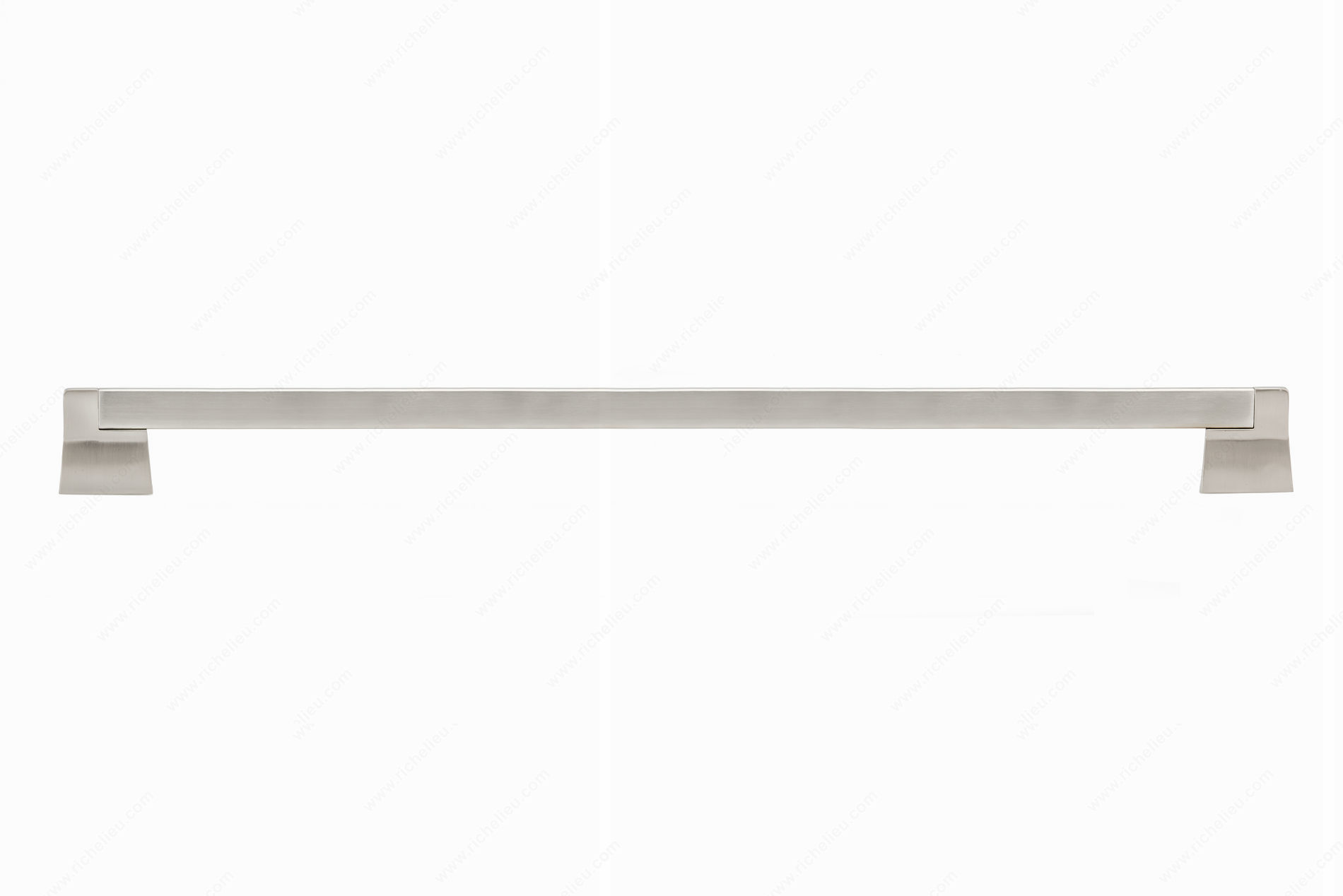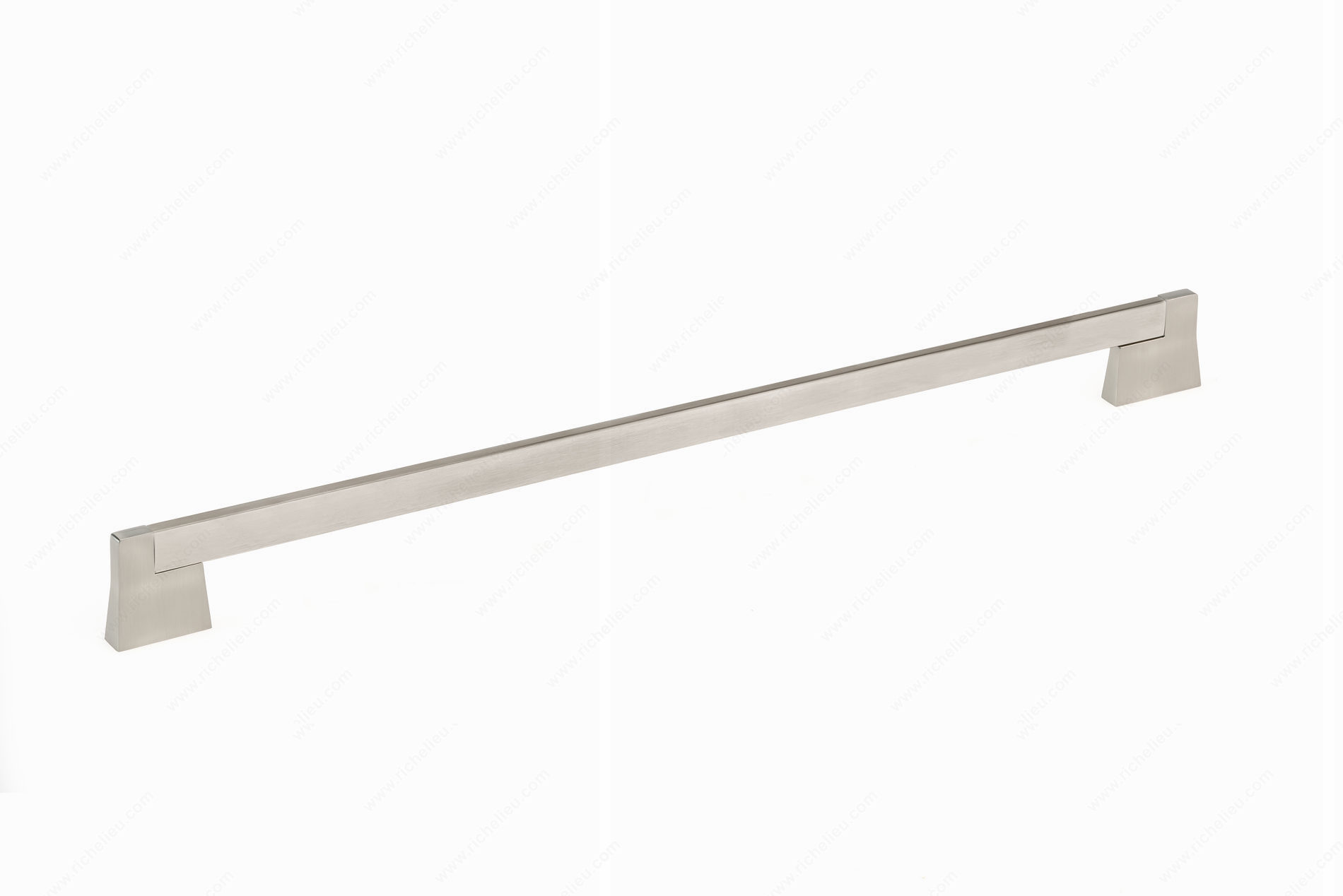 Richelieu BP8727480195 Modern Metal Pull - 8727 showcases a striking geometric design that enhances the aesthetics of any furniture or cabinetry. This pull features flared rectangular posts, offering a contemporary look that seamlessly blends with modern interiors. Crafted from durable aluminum and Zamak, it ensures longevity while maintaining a sleek appearance. With a center-to-center measurement of 18 7/8 inches and an overall length of 20 1/4 inches, this pull provides ample space for a comfortable grip. The brushed nickel finish in a sophisticated gray and chrome color complements various design schemes, making it a versatile choice for any project. The pull's dimensions include a projection of 1 17/32 inches and a width of 11/32 inches, allowing it to stand out without overwhelming the surrounding decor. Included with the pull are 8/32 inch screws, ensuring easy installation. Part of a new collection, the BP8727480195 is designed to coordinate with other pieces in the Urban series, allowing for a cohesive look throughout your space. Elevate your cabinetry and furniture with this modern pull, combining style and functionality effortlessly.