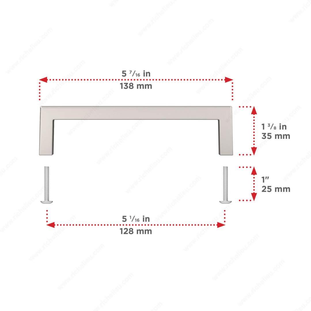 Richelieu BP873128180 Modern Metal Pull - 873 adds a touch of sophistication to your cabinetry with its sleek, right-angled design. Crafted from durable Zamak, this pull offers both style and strength, making it an ideal choice for modern kitchens and bathrooms. The polished nickel finish, paired with gray and chrome accents, enhances the aesthetic appeal, ensuring it complements a wide range of interior decors. Measuring 5 7/16 inches in overall length with a center-to-center distance of 5 1/32 inches, this pull fits seamlessly into existing cabinetry. Its base diameter of 13/32 inch and a projection of 1 3/8 inches provide a comfortable grip while maintaining a refined appearance. The pull is designed for easy installation, coming with 8/32-inch screws included for your convenience. Part of the complete 873 collection, this modern pull not only enhances functionality but also elevates the overall style of your space. Whether you're renovating or updating your kitchen or bathroom, the Richelieu BP873128180 is the perfect accessory to bring a polished look to your cabinets. Enjoy effortless access with a design that speaks to contemporary elegance and quality craftsmanship.