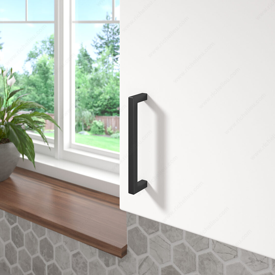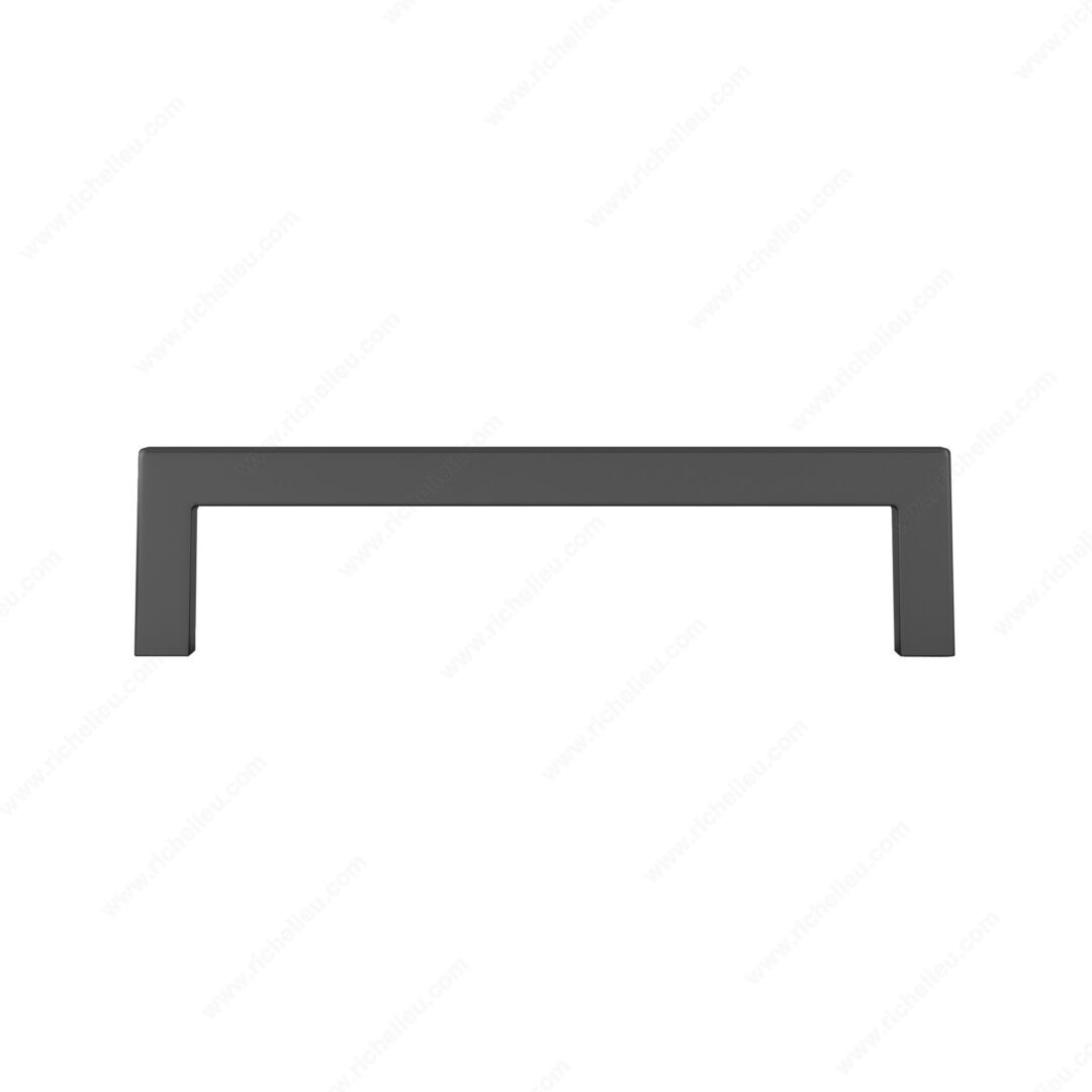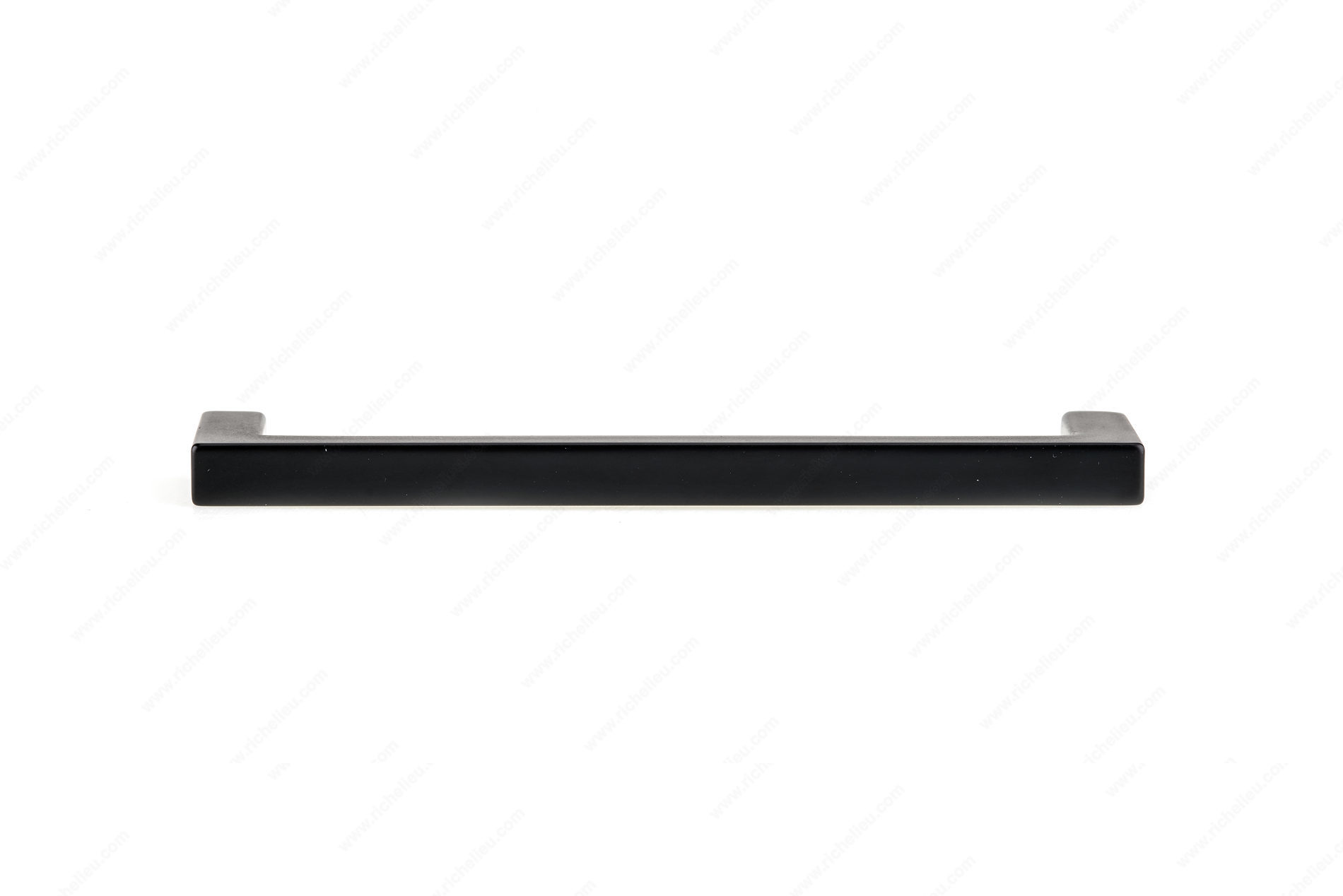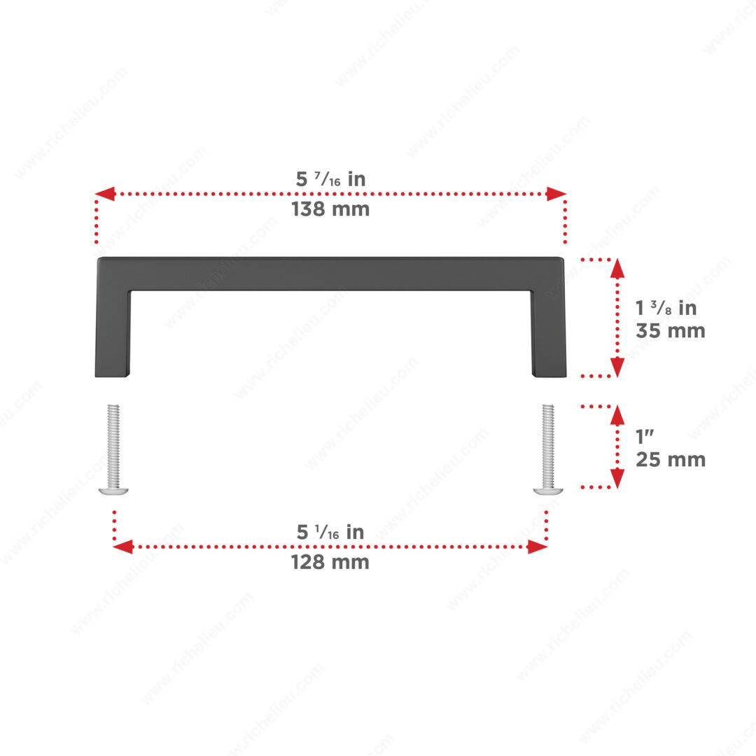 Richelieu BP873128900 Modern Metal Pull - 873 delivers a sleek, contemporary touch to your kitchen and bathroom cabinets. This right-angled pull, finished in a sophisticated matte black, seamlessly complements a variety of interior styles, enhancing the overall aesthetic of your space. Crafted from durable zamak, this pull not only showcases modern design but also ensures longevity and resilience. With an overall length of 5 7/16 inches and a center-to-center measurement of 5 1/32 inches, it provides an easy grip while maintaining a streamlined appearance. The base diameter measures 13/32 inches, contributing to its minimalist charm without compromising functionality. The pull has a projection of 1 3/8 inches, allowing for convenient access even in tight spaces. Installation is straightforward, thanks to the included 8/32 inch screws, making it a practical choice for DIY enthusiasts and professionals alike. This pull is part of the complete Richelieu 873 collection, offering the opportunity to create a cohesive look throughout your cabinetry. Whether you're upgrading your home or working on a new project, the Richelieu BP873128900 Modern Metal Pull adds a touch of elegance and modernity to any interior.