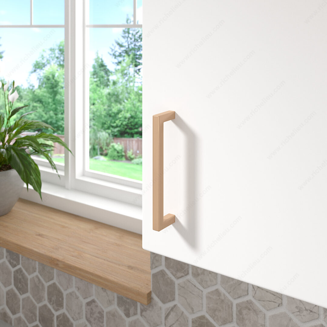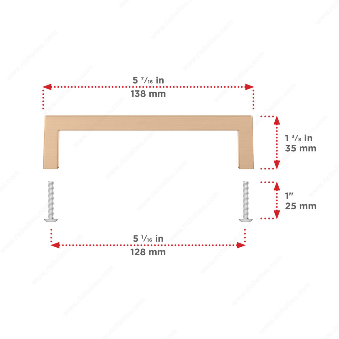 Richelieu BP873128CHBRZ Modern Metal Pull - 873 offers a contemporary design that elevates the aesthetic of any kitchen or bathroom cabinetry. Crafted from durable zamak, this pull features a modern right-angled profile that combines form and function seamlessly. Its striking champagne bronze finish adds warmth and sophistication, making it an ideal choice for those looking to enhance their interior décor. With an overall length of 5 7/16 inches and a base diameter of 13/32 inches, this pull is designed for comfortable grip and ease of use. The center-to-center measurement of 5 1/32 inches allows for straightforward installation, making it suitable for various cabinet styles. The projection of 1 3/8 inches ensures it stands out while remaining practical. Included with the pull are 8/32 inch screws, simplifying the installation process. This piece is part of Richelieu's New Collection and fits seamlessly within the broader 873 collection, offering versatility for different applications. Whether you're renovating or building, the Richelieu BP873128CHBRZ adds a distinguished touch to your spaces while promising durability and style. Embrace modern elegance with this exceptional metal pull, a perfect addition to elevate your cabinetry.
