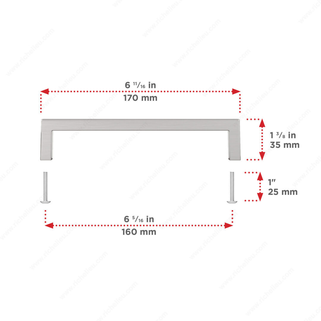 Richelieu BP873160195 Modern Metal Pull - 873 brings a contemporary touch to your kitchen and bathroom cabinetry. Designed with a sleek right-angled profile, this pull enhances the aesthetic appeal of modern interiors, making it an ideal choice for those looking to elevate their décor. Crafted from durable zamak, it not only promises longevity but also offers a refined brushed nickel finish that complements various color palettes. With an overall length of 6 11/16 inches and a center-to-center measurement of 6 5/16 inches, this pull is both functional and stylish. The base diameter of 13/32 inches adds to its sturdy design while ensuring a comfortable grip. Its projection of 1 3/8 inches allows for easy access, making it a practical addition to cabinets and drawers alike. The pull is available in a chic gray and chrome color scheme, fitting seamlessly into any modern design scheme. Installation is straightforward with included 8/32 inch screws, allowing for quick updates to your cabinetry. Part of the complete 873 collection, the Richelieu BP873160195 is perfect for homeowners and professionals looking to make a statement with high-quality hardware that combines style and functionality.