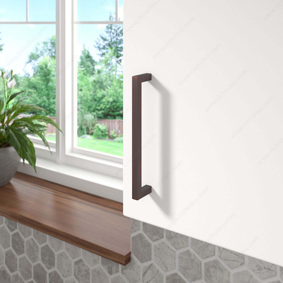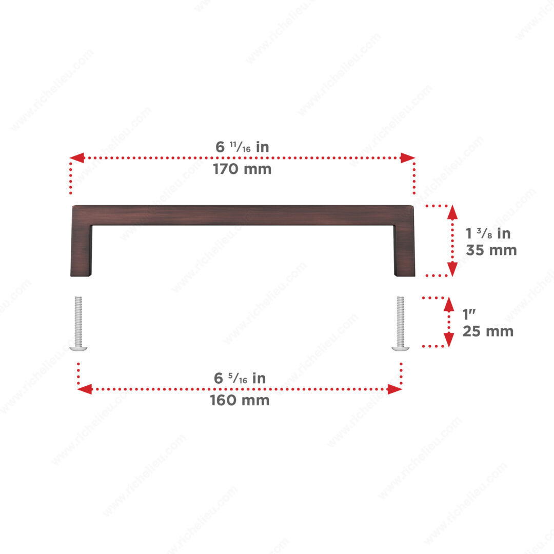 Richelieu BP873160BORB Modern Metal Pull - 873 introduces a touch of sophistication to your cabinetry. This modern right-angled pull is designed to enhance the aesthetic of both kitchen and bathroom cabinets, making it an ideal choice for homeowners and professionals seeking a stylish upgrade. Crafted from high-quality Zamak, the pull boasts a brushed oil-rubbed bronze finish that adds depth and warmth to your interiors. With an overall length of 6 11/16 inches and a center-to-center measurement of 6 5/16 inches, it offers both functionality and elegance. The base diameter of 13/32 inches ensures a sturdy grip, while the 1 3/8 inches projection allows for easy access. The Richelieu BP873160BORB pull is part of the complete 873 collection, ensuring a cohesive design throughout your space. Each pull comes with an 8/32 inch screw, making installation straightforward and hassle-free. Perfect for modern designs, this pull not only stands out visually but also complements a wide range of décor styles. Elevate your cabinetry with the distinguished look of Richelieu's Modern Metal Pull, where form meets function seamlessly.