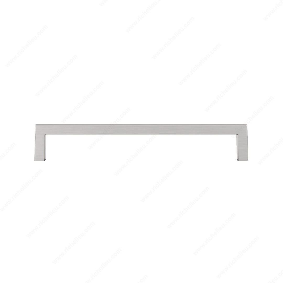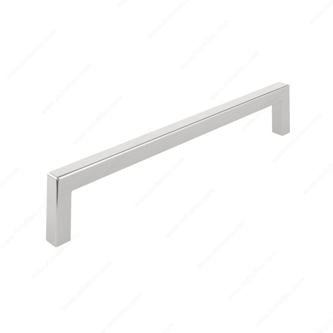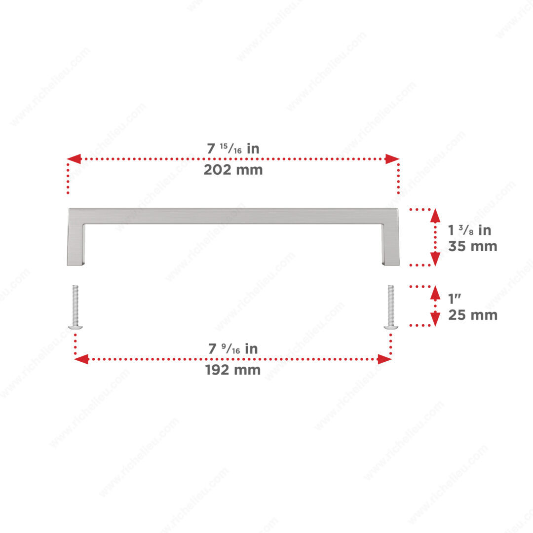 Richelieu BP873192195 Modern Metal Pull - 873 combines sleek design with functionality, making it an ideal choice for elevating the aesthetic of your kitchen and bathroom cabinets. This modern right-angled pull features a sophisticated brushed nickel finish, enhancing both contemporary and traditional interiors. Measuring 7 15/16 inches in length with a center-to-center spacing of 7 9/16 inches, this pull is designed for easy installation. Its base diameter is 13/32 inches, providing a robust grip, while the projection of 1 3/8 inches ensures a comfortable reach. Crafted from durable Zamak, the pull promises lasting quality and strength. The stylish gray and chrome color combination adds a distinguished touch, making it a versatile addition to various cabinet styles. Each pull comes complete with 8/32 inch screws, facilitating straightforward installation. Part of the comprehensive 873 collection by Richelieu, this pull not only enhances your cabinetry but also seamlessly integrates with other pieces in the collection. Elevate your space with the Richelieu BP873192195 Modern Metal Pull, where modern design meets practical elegance. Perfect for building professionals and discerning homeowners alike.