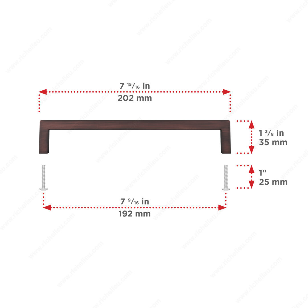 Richelieu BP873192BORB Modern Metal Pull - 873 offers a sleek, right-angled design that brings a touch of sophistication to any kitchen or bathroom cabinetry. Crafted from high-quality zamak, this modern pull not only ensures durability but also enhances the aesthetics of your space. The brushed oil-rubbed bronze finish adds a rich, timeless element, making it a versatile choice that complements a variety of interior styles. With an overall length of 7 15/16 inches and a center-to-center measurement of 7 9/16 inches, this pull is designed for ease of use while providing a comfortable grip. The base diameter measures 13/32 inches, and the projection stands at 1 3/8 inches, making it a practical addition to cabinets and drawers alike. Each pull comes complete with an 8/32 inch screw for easy installation. The rich brown and bronze color palette further elevates its modern appeal, allowing it to coordinate seamlessly with other hardware in your space. Whether you are renovating your home or simply updating your cabinetry, the Richelieu BP873192BORB pull is an excellent choice that combines style and functionality, promising to enhance your interior decor for years to come.