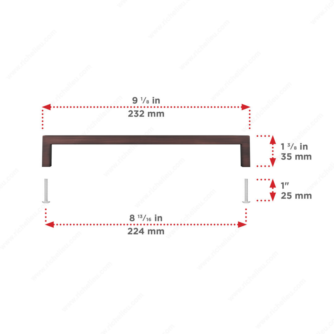 Richelieu BP873224BORB Modern Metal Pull - 873 offers a sleek and sophisticated enhancement to your kitchen and bathroom cabinetry. Crafted from durable zamak, this modern pull showcases a right-angled design that seamlessly integrates with various interior styles. The brushed oil-rubbed bronze finish adds a touch of elegance, making it an ideal choice for contemporary spaces. With an overall length of 9 7/32 inches and a center-to-center measurement of 8 13/16 inches, this pull is both functional and visually appealing. The base diameter of 13/32 inches ensures a sturdy grip, while the projection of 1 3/8 inches provides ample space for easy access. Each pull comes with an included 8/32 inch screw for straightforward installation. Available in a rich brown and bronze colorway, the Richelieu BP873224BORB is versatile enough to complement all collections in the 873 series. Whether you're remodeling your home or simply upgrading your cabinetry, this modern pull is designed to enhance the overall aesthetic of your interiors. Ship via UPS for added convenience and experience the quality that Richelieu is known for. Elevate your space with this stylish and functional hardware solution.