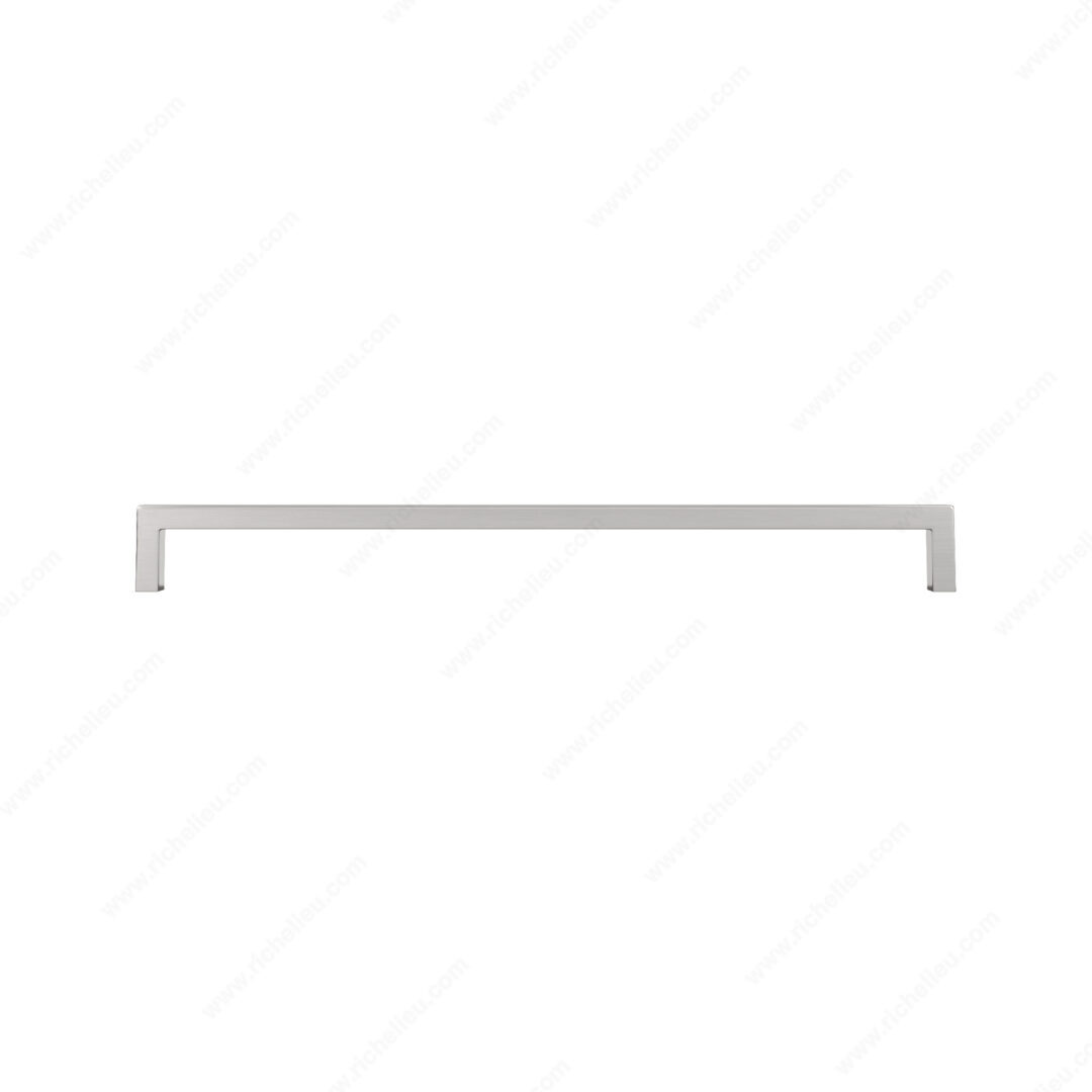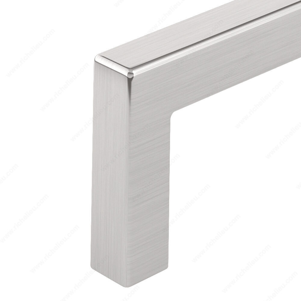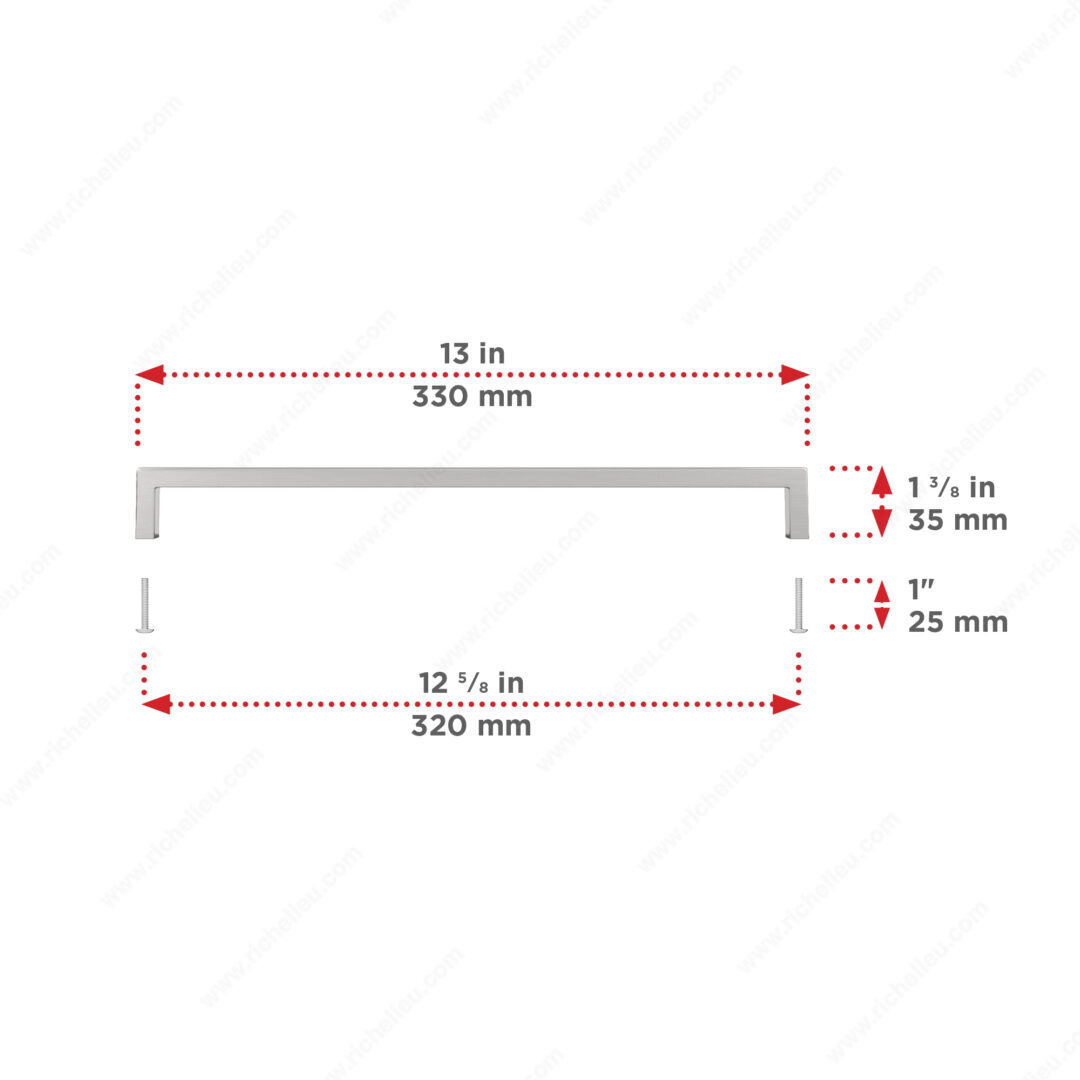 Richelieu BP873320195 Modern Metal Pull - 873 offers a striking right-angled design that enhances the elegance of any kitchen or bathroom cabinetry. Crafted from durable Zamak, this pull combines functionality with sophisticated aesthetics, making it an ideal choice for contemporary spaces. With an overall length of 13 inches and a center-to-center measurement of 12 5/8 inches, this pull is perfectly sized for most cabinet doors and drawers. The brushed nickel finish, identified by the finish number 195, beautifully complements the modern gray and chrome color scheme, adding a refined touch to your interiors. The base diameter of 13/32 inches and a projection of 1 3/8 inches ensure a comfortable grip, while the included 8/32 inch screws simplify installation. The Richelieu BP873320195 is part of the comprehensive 873 collection, allowing for cohesive design throughout your space. Designed for versatility, this modern pull is suitable for various cabinet styles, enhancing both form and function. Whether you are renovating your home or completing a new build, this pull is an excellent choice for those seeking quality and contemporary design in their hardware selections.