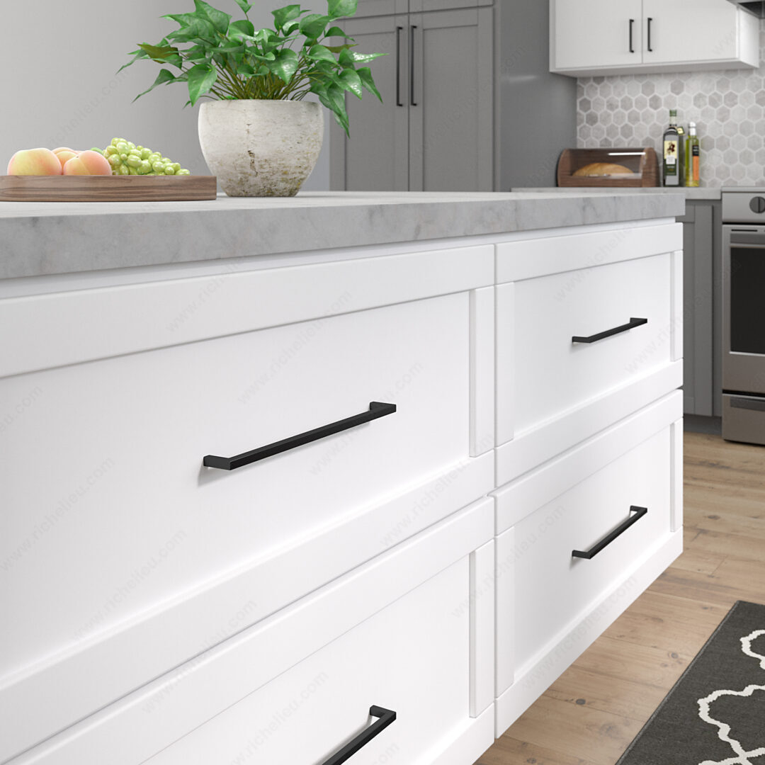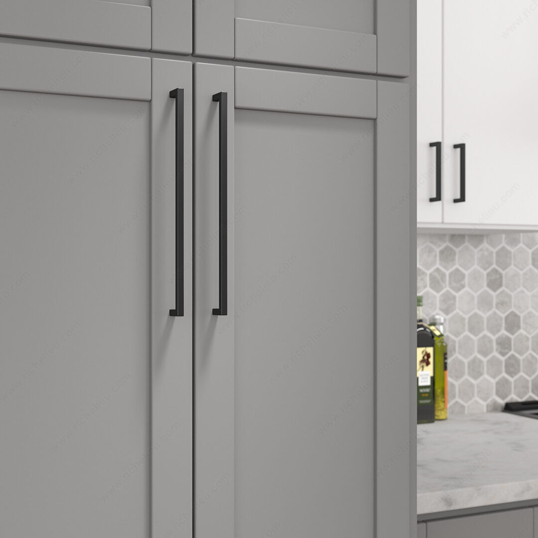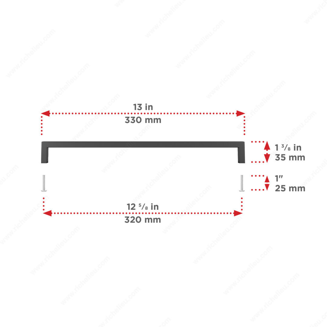 Richelieu BP873320900 Modern Metal Pull - 873 effortlessly combines style and functionality, making it an ideal choice for enhancing the aesthetic of kitchen and bathroom cabinetry. With its sleek, right-angled design, this pull adds a contemporary touch that complements a range of interior decors. Crafted from durable Zamak material, the pull features a striking matte black finish that not only looks sophisticated but also ensures longevity. Measuring 13 inches in overall length and boasting a base diameter of 13/32 inches, the pull is designed for comfortable grip and ease of use. The center-to-center measurement of 12 5/8 inches allows for versatile installation across various cabinet configurations. The overall projection of 1 3/8 inches provides ample space for a firm hold, making it ideal for everyday use. Each pull is accompanied by an 8/32 inch screw for straightforward installation. Additionally, the BP873320900 is part of the comprehensive 873 collection, allowing for coordinated design across multiple elements in your space. Whether you're embarking on a renovation or seeking to update your cabinetry, the Richelieu Modern Metal Pull is a perfect solution that combines elegance with practicality, ensuring your cabinetry stands out with style.