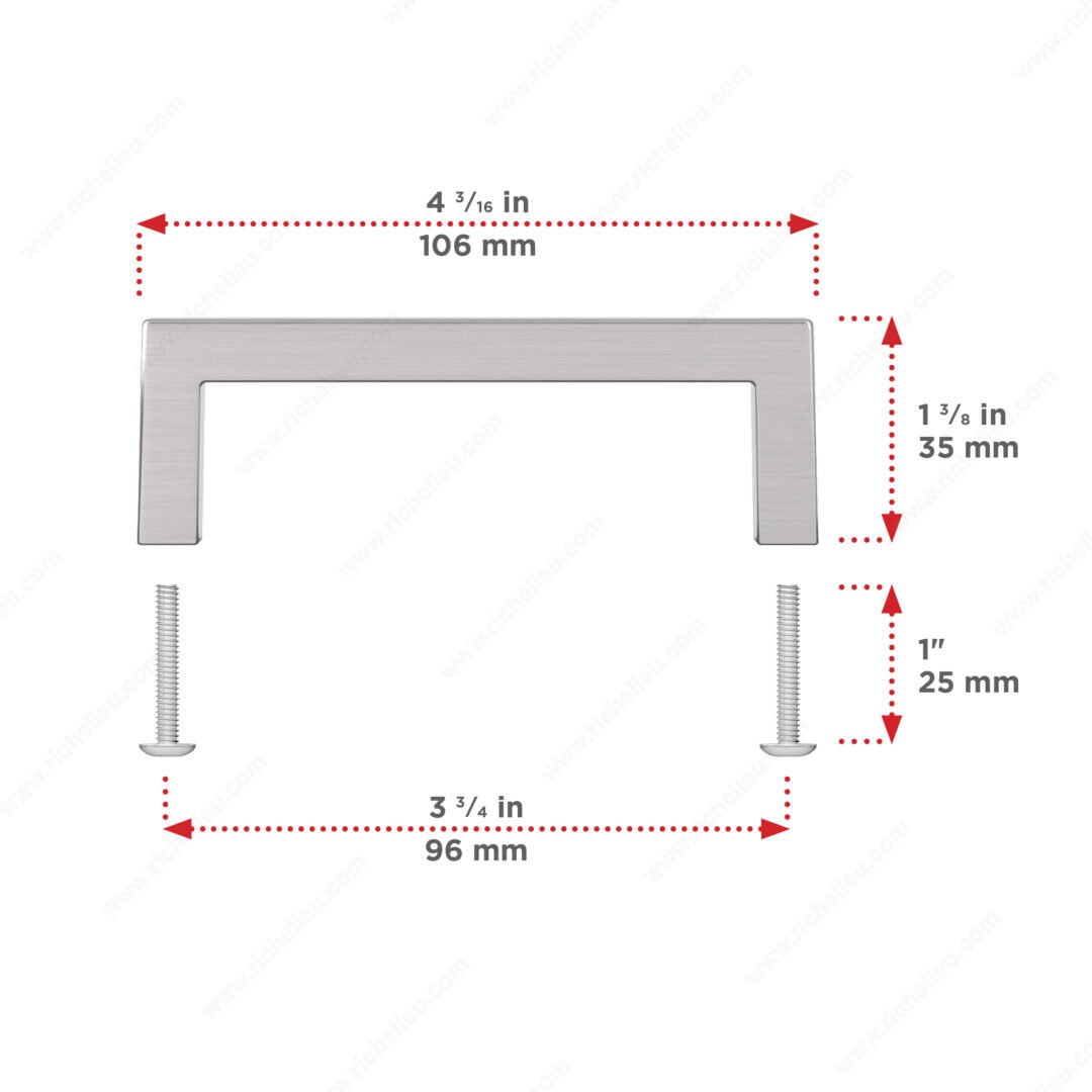 Richelieu BP87396195 Modern Metal Pull - 873 offers a sleek and contemporary design that elevates any kitchen or bathroom cabinetry. Characterized by its right-angled shape, this pull not only reflects modern aesthetics but also enhances the overall style of your furniture. Crafted from durable Zamak, it promises longevity while maintaining its sophisticated appearance. The brushed nickel finish, designated as Finish Number 195, adds a touch of elegance and complements a variety of interior décors, making it a versatile choice for both residential and commercial applications. Measuring 4 3/16 inches in length with a base diameter of 13/32 inches, the pull features a center-to-center spacing of 3 25/32 inches, ensuring compatibility with standard cabinet installations. With a projection of 1 3/8 inches, it provides a comfortable grip for daily use, while the included 8/32 inch screws simplify installation. Available in a stylish gray and chrome color scheme, the Richelieu BP87396195 is part of the complete 873 collection, allowing for cohesive design across your cabinetry. With its modern flair and functional design, this pull is an excellent choice for those looking to enhance their space with quality hardware.