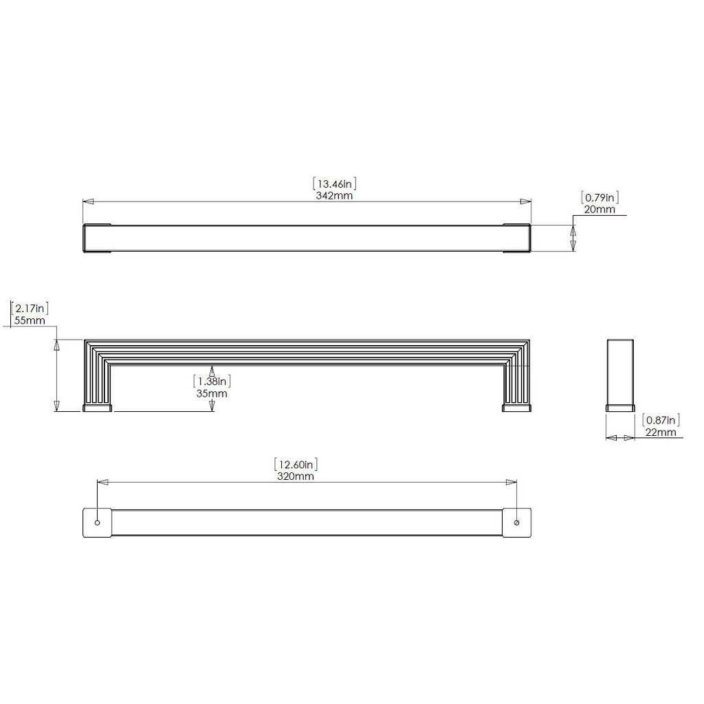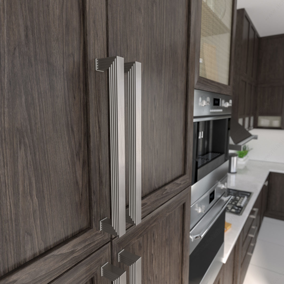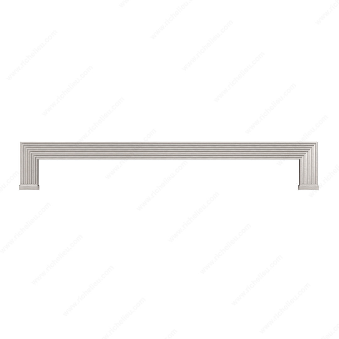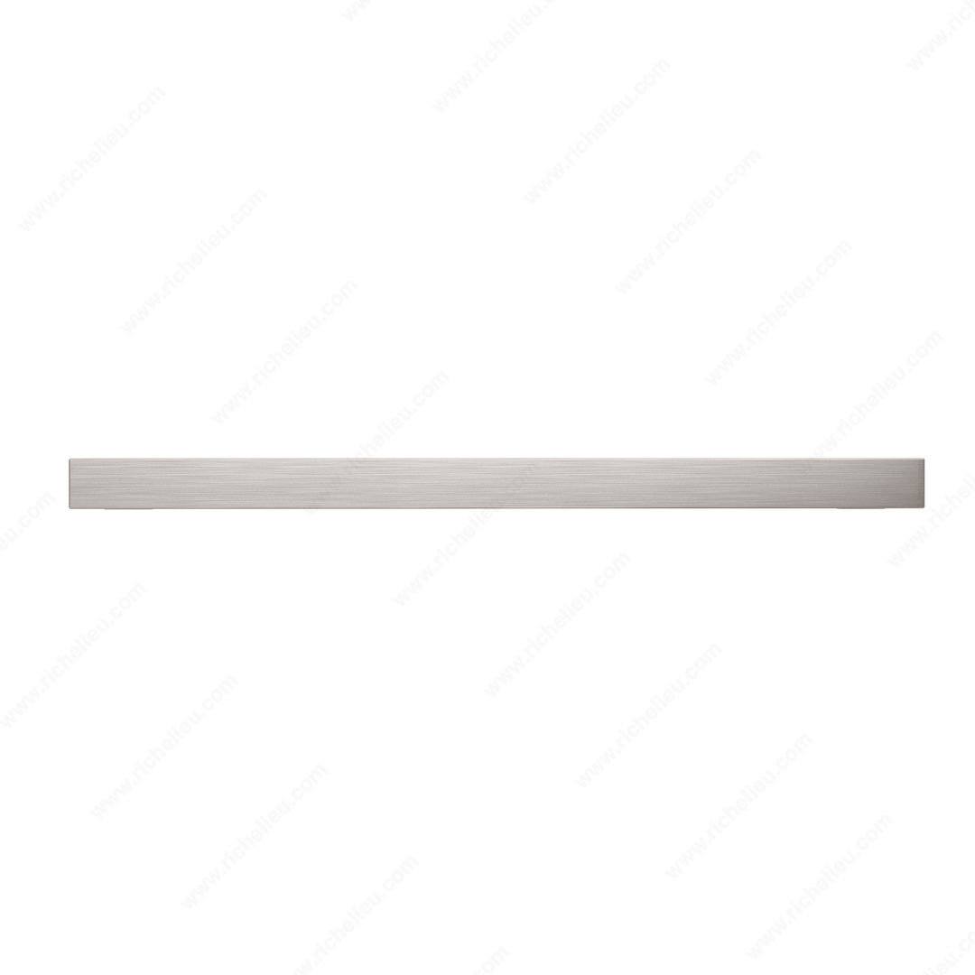 Richelieu BP8788320195 Transitional Metal Pull - 8788 seamlessly combines style and functionality, making it an ideal choice for modern furnishings. This appliance pull features a smooth-faced design that is accentuated by elegant grooves on both the top and bottom, adding a sophisticated touch to any cabinet or drawer. Measuring 13 1/2 inches in length with a center-to-center distance of 12 5/8 inches, this pull is crafted from durable Zamak, ensuring longevity and resilience in high-traffic areas. The brushed nickel finish, identified by finish number 195, lends a contemporary flair with its gray and chrome tones, perfectly complementing various decor styles. With an overall projection of 2 5/32 inches and a width of 7/8 inch, the BP8788320195 is designed for comfortable grip and ease of use. Each pull comes with 8/32 inch screws for hassle-free installation. Part of Richelieu’s New Collection, this transitional pull is not just functional but also serves as a statement piece in kitchen and bathroom design. Elevate your space with the refined elegance of Richelieu's BP8788320195 Transitional Metal Pull, where quality meets aesthetic appeal.